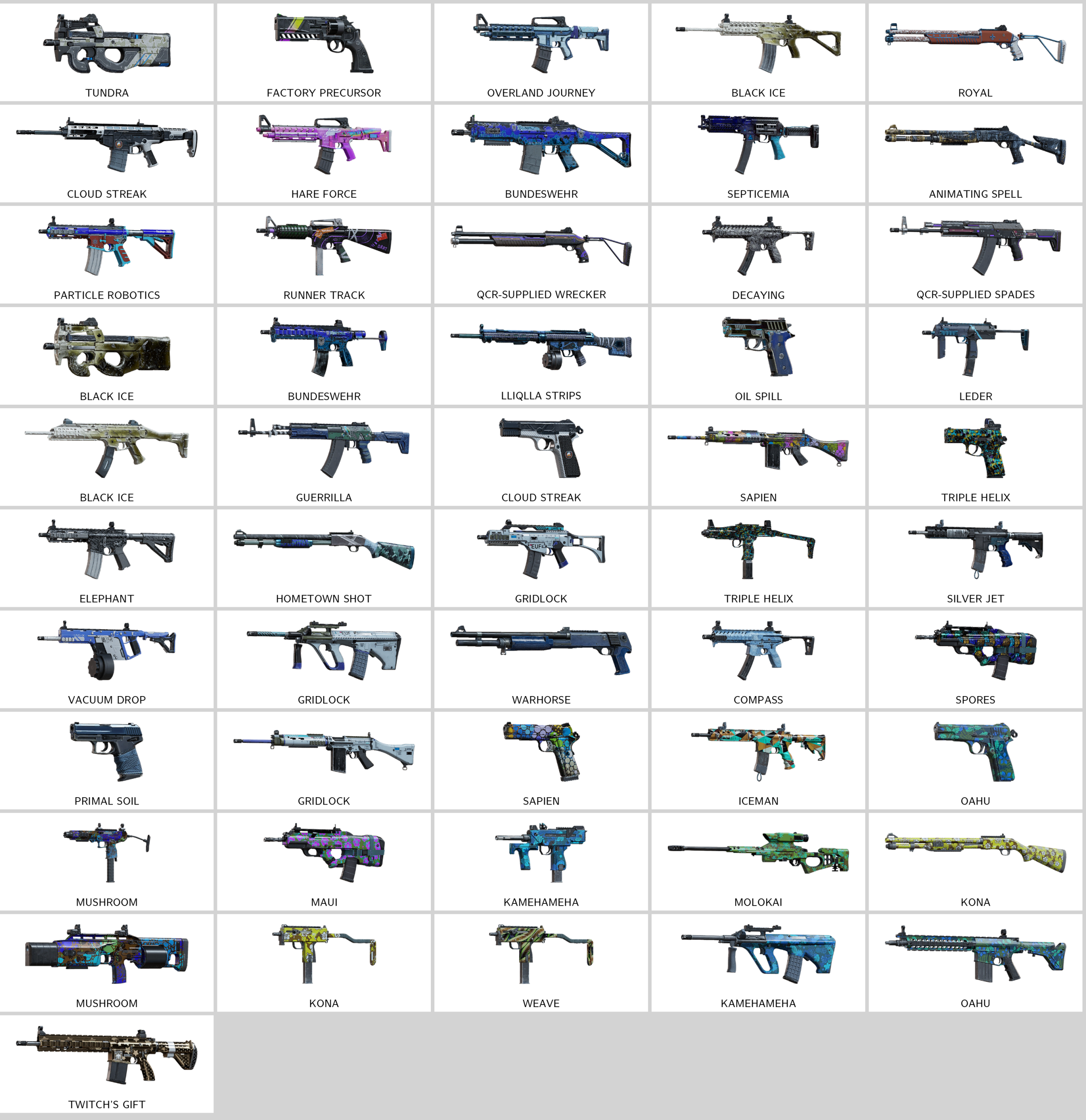 – Tundra (P90), Ethereal Marksman (416-C), Scavenged Wonder (CAMRS), Overland Journey (TCSG12), Fit and Finish (AK12), Modern Gleam (SASG-12)…