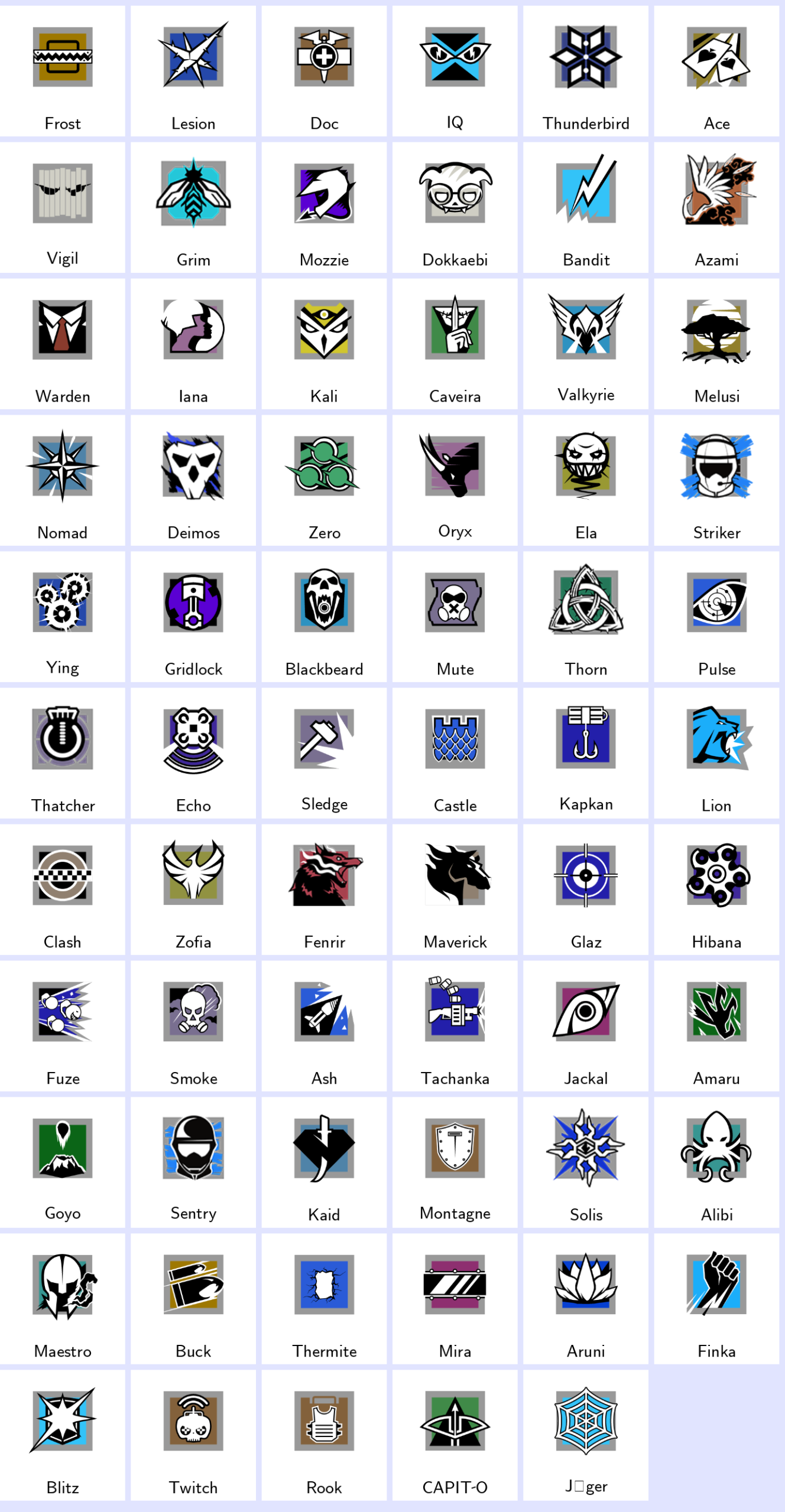 Some Operators: Frost, Lesion, Doc, Iq, Thunderbird, Ace, Vigil, Grim, Mozzie, Dokkaebi…