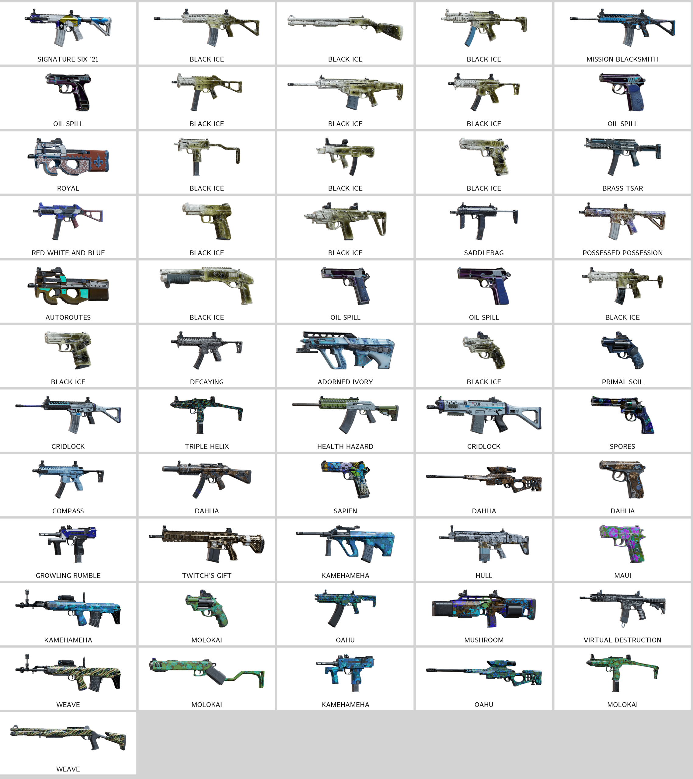 Some of Other Skins: Mission Blacksmith (556XI), Oil Spill (GSH-18), New Notches (P226), Target (R4C), Vegvisir (D-50), Dwyer Hill (C8-SFW), Royal (P90), Autoroutes (P90)…