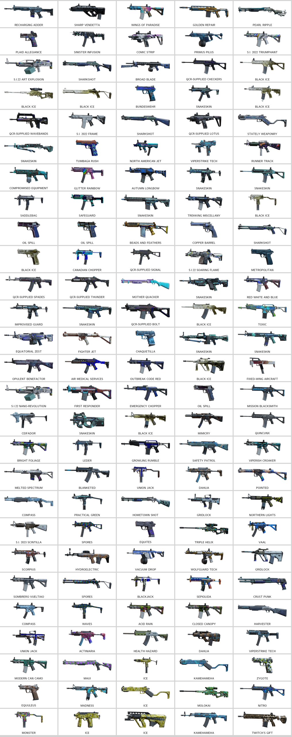 Some Skins: Maui, Improvised Guard, Qcr-Supplied Wavebands, Health Hazard, Leder, Gridlock, Madness, Golden Repair, Safeguard, Saddlebag, Trekking Miscellany, Dahlia, Harvester, Equuleus, S.I. 2022 Triumphant, Sharkshot, Fixed-Wing Aircraft, Snakeskin, Blackjack, Closed Canopy, Compass, Equites, Acid Rain, Broad Blade, Hometown Shot, Red White And Blue, Mission Blacksmith, Vaal, Pearl Ripple, Spores, Pointed, Crust Punk, Triple Helix, Emergency Chopper, Equatorial Zest, Wolfguard Tech, Qcr-Supplied Lotu…