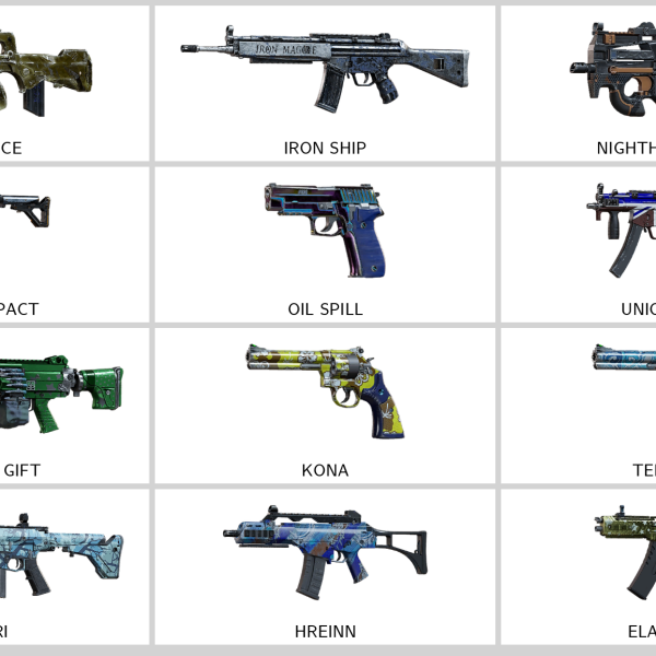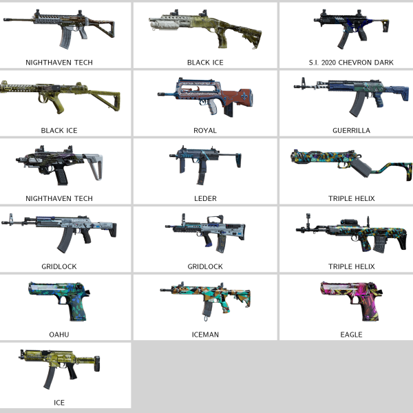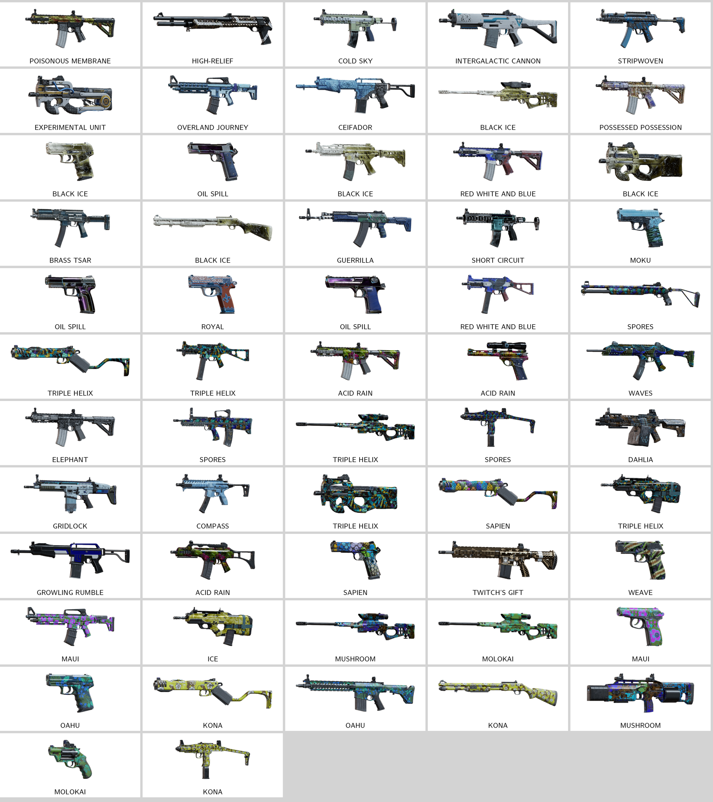 – Experimental Unit (P90), Urban Graffiti (Type-89), Intergalactic Cannon (552 Commando), High-Relief (Super 90), Stone Talon (T-5 SMG), Unbreakable Shine (CSRX300)…
