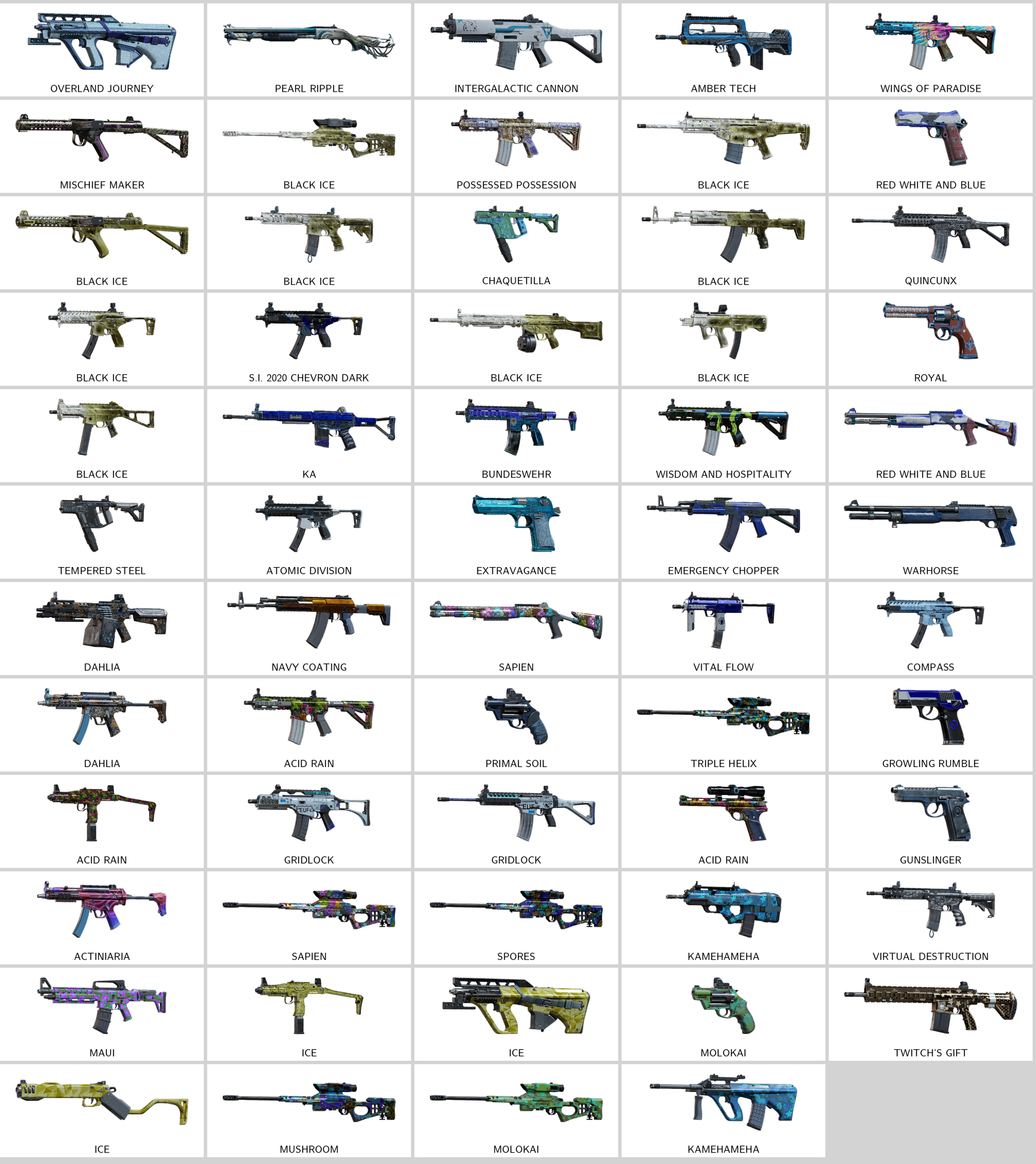 – Amber Tech (F2), Air Raid (CSRX300), Intergalactic Cannon (552 Commando), Overland Journey (AUG A3), Gladius (ALDA 5.56), Riveted Scraps (P90)…
