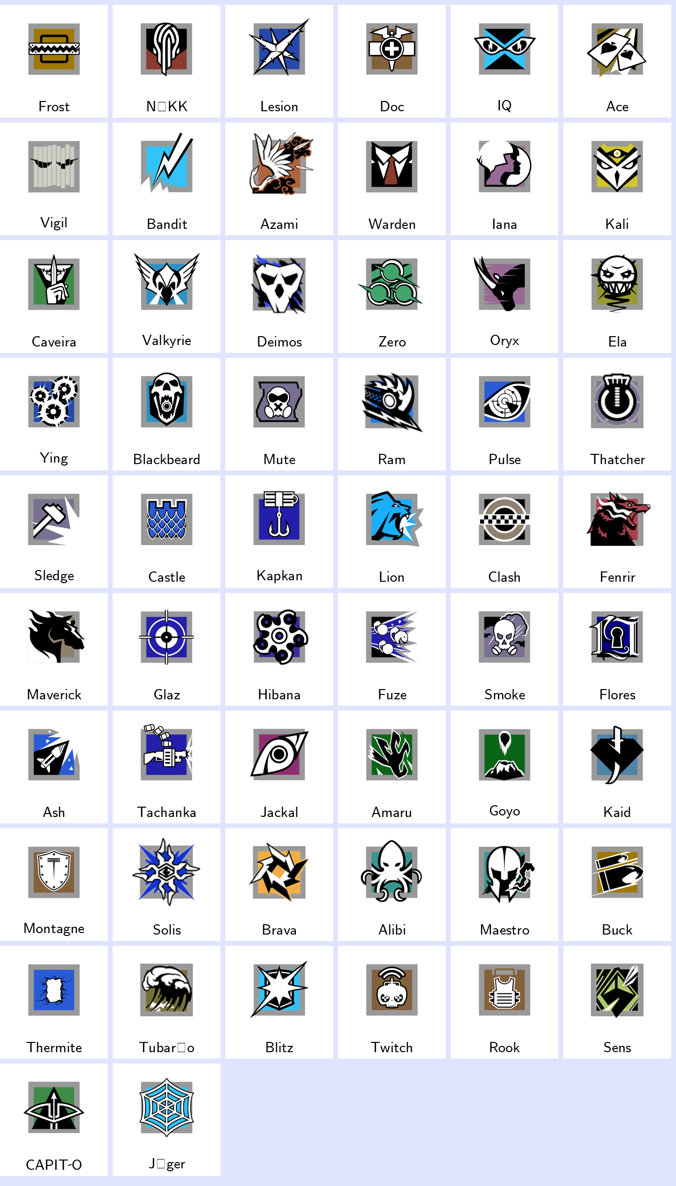 Some Operators: Frost, Nokk, Lesion, Doc, Iq, Ace, Vigil, Bandit, Azami, Warden…