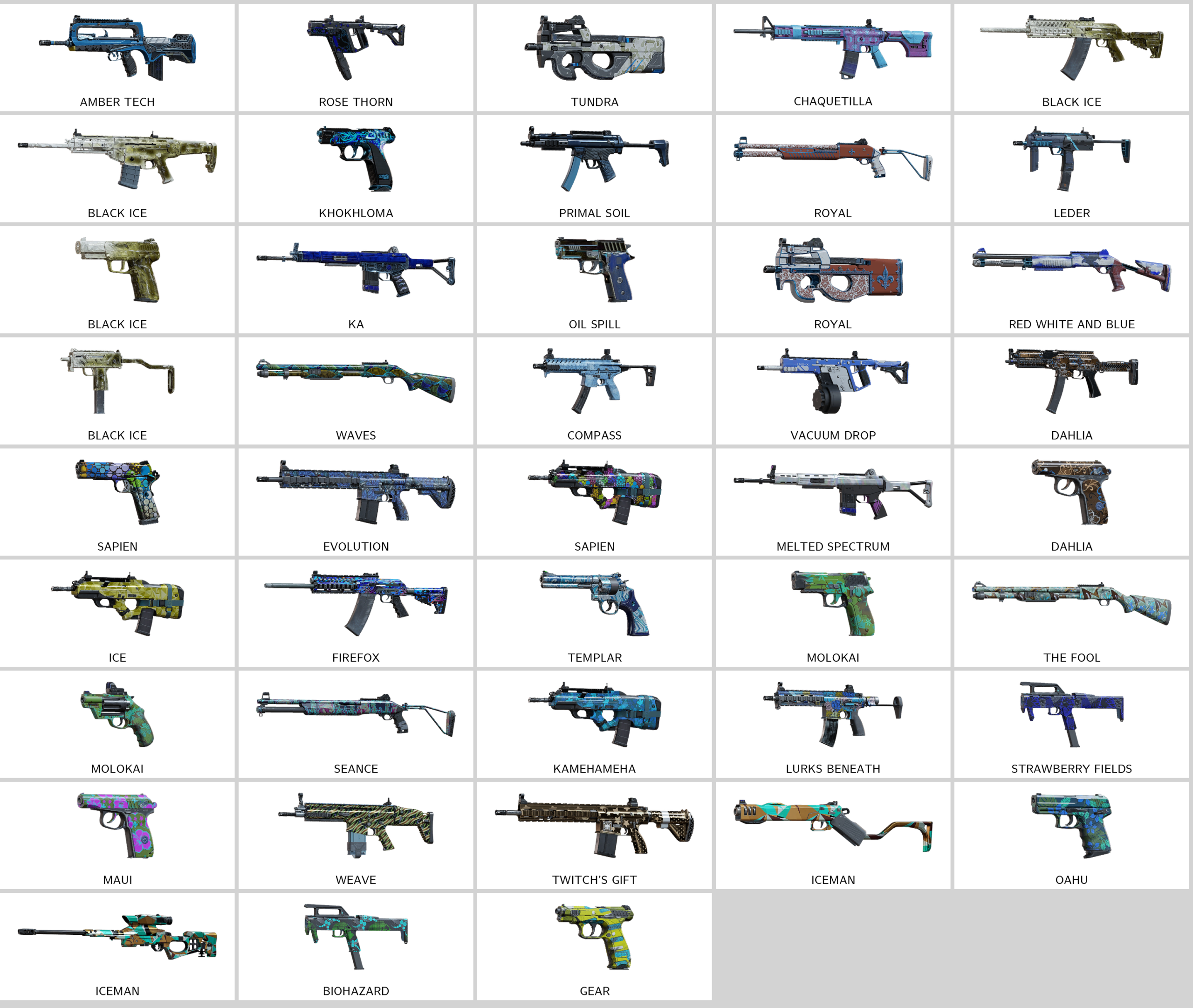 Some of Other Skins: Royal (SG-CQB), Primal Soil (MP5), Target (R4C), Vegvisir (D-50), Wild Instinct (TCSG12), Royal (P90), Chaquetilla (C7E), Tally (MP5K)…