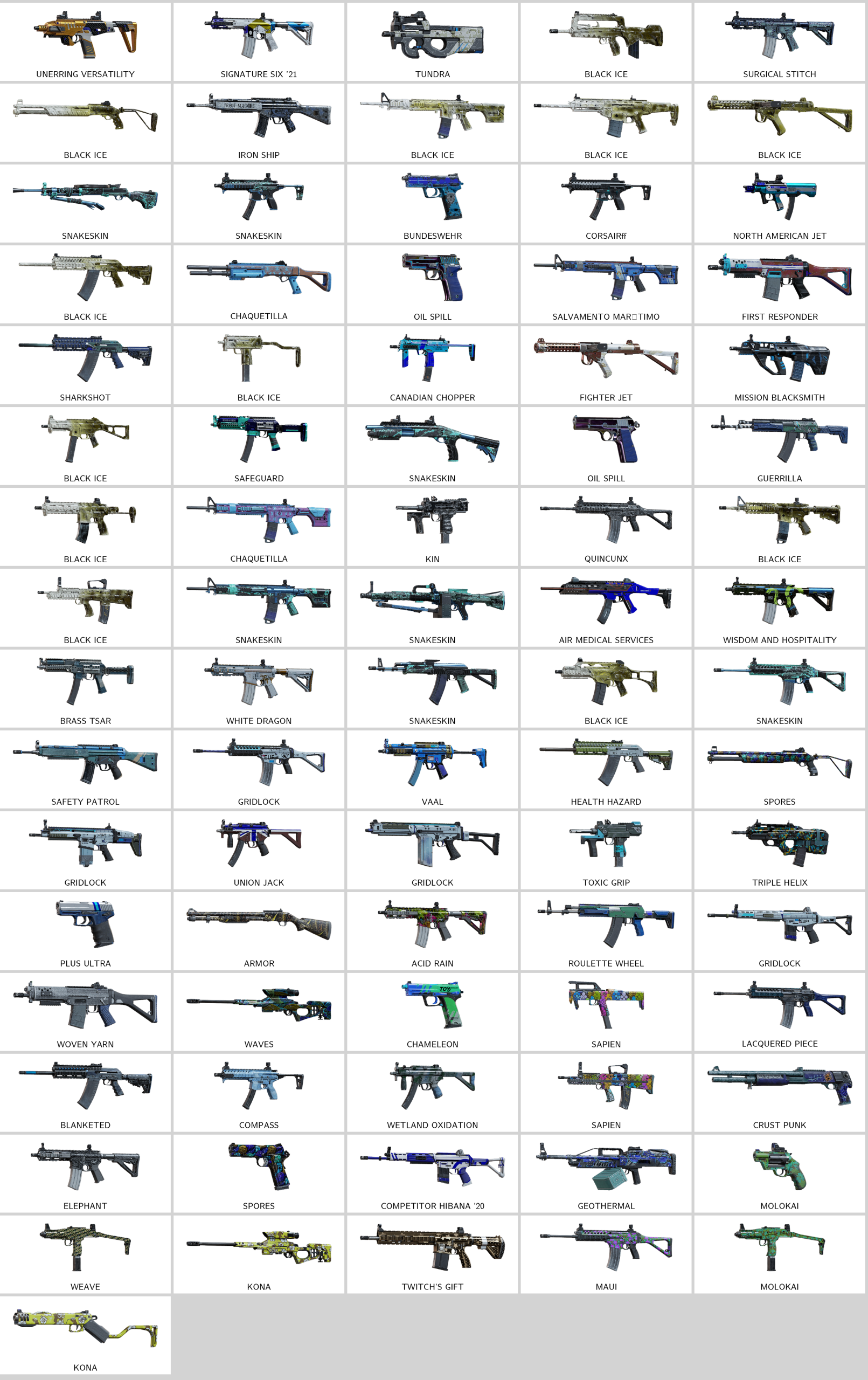 Some of Other Skins: Snakeskin (DP27), Snakeskin (MPX), Bundeswehr (P12), New Notches (P226), Target (R4C), Hive Mind (ARX200), Venetian Golden Age (Mx4 Storm), Sharkshot (SASG-12)…