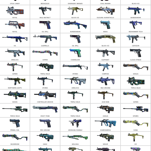 – Tundra (P90), Unerring Versatility (P10 Roni), Intergalactic Cannon (AUG A2), Maximized Design (M1014), Tentacle Lace (Mx4 Storm), Immaculate (SPSMG9)…