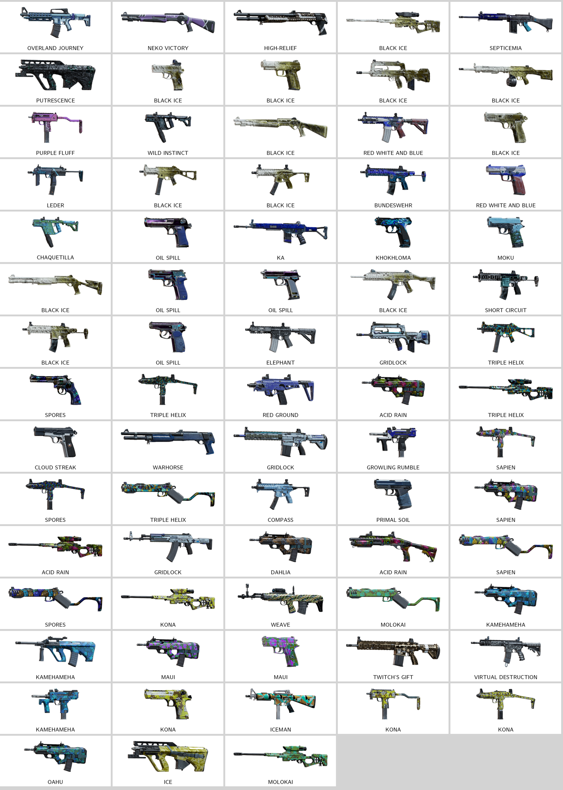 – Ethereal Marksman (416-C), Metallurgic Burn (9mm C1), Urban Graffiti (Type-89), High-Relief (Super 90), Stone Talon (T-5 SMG), Viral Douser (F2)…