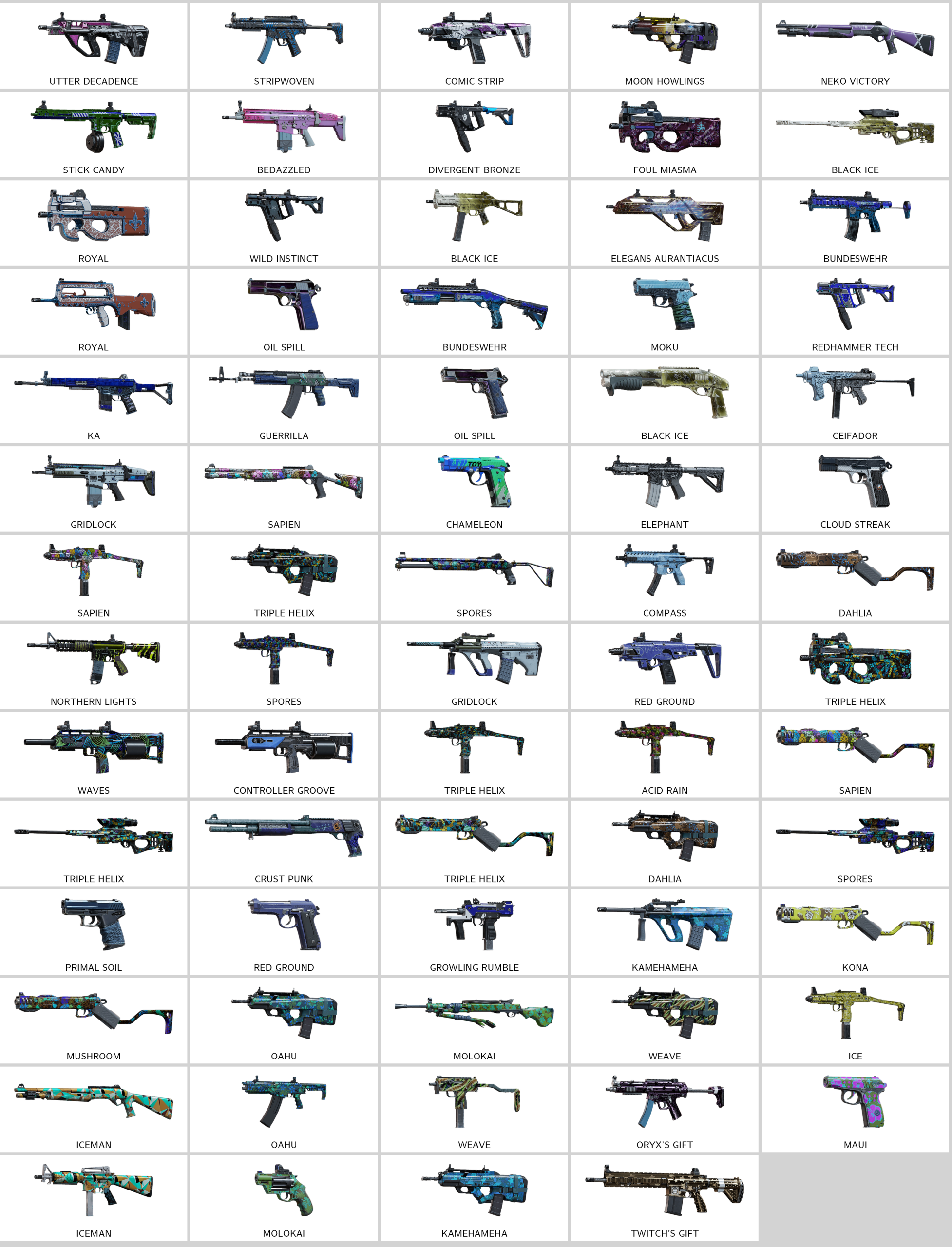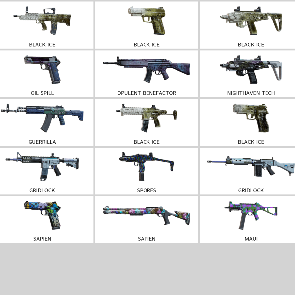 – Ethereal Marksman (416-C), Arctic Range (C8-SFW), Flight of Triumph (M12), Comic Strip (P10 Roni), Urban Graffiti (Type-89), Scavenged Wonder (PARA-308)…