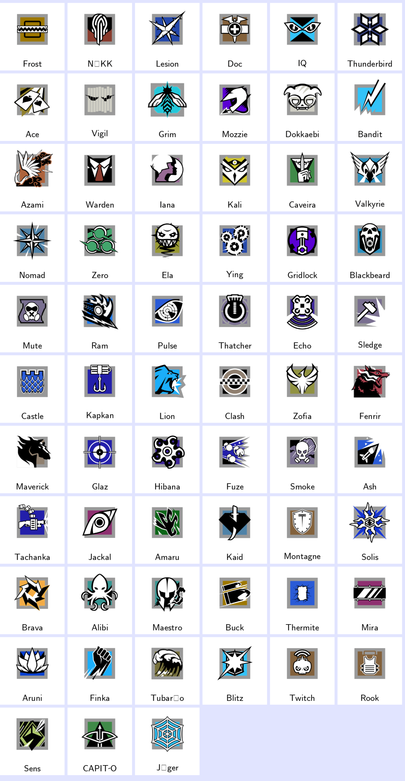 Some Operators: Frost, Nokk, Lesion, Doc, Iq, Thunderbird, Ace, Vigil, Grim, Mozzie…