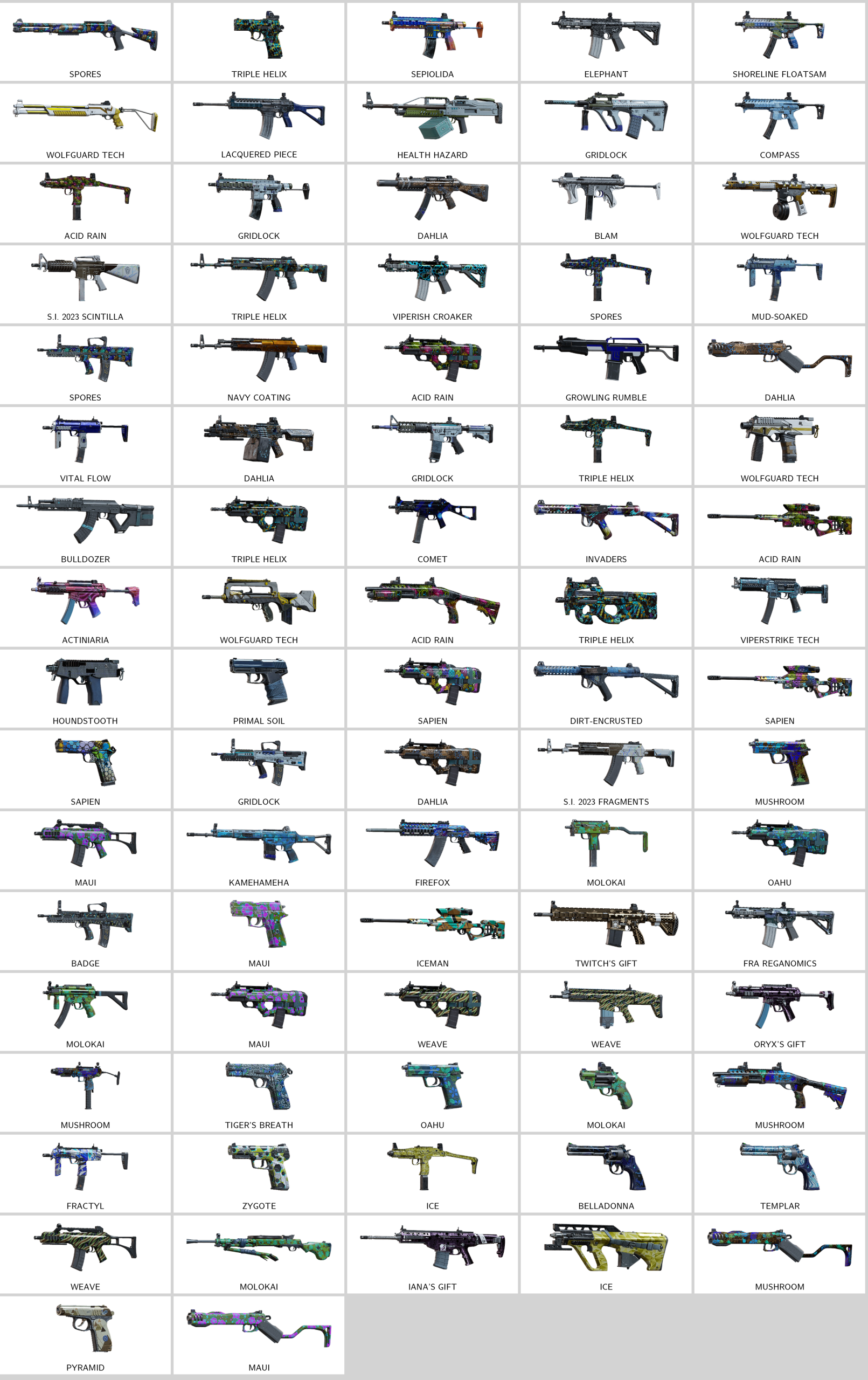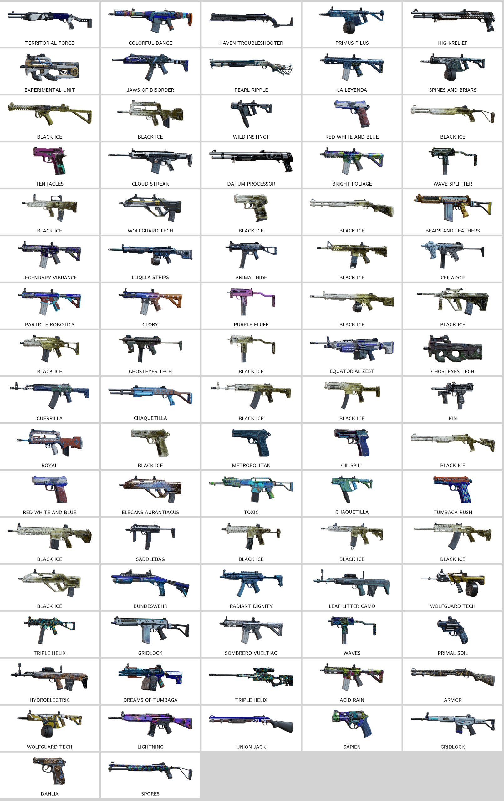 – Colorful Dance (ARX200), Experimental Unit (P90), Urban Graffiti (Type-89), Tentacle Lace (ACS12), High-Relief (Super 90), Stone Talon (T-5 SMG)…
