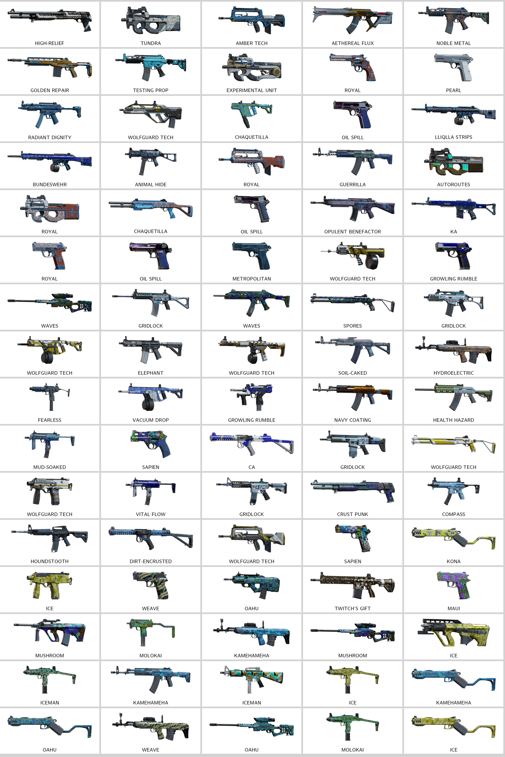 – Testing Prop (K1A), Tundra (P90), Flight of Triumph (M12), Amber Tech (F2), Experimental Unit (P90), Genesis Marks (OTs-03)…