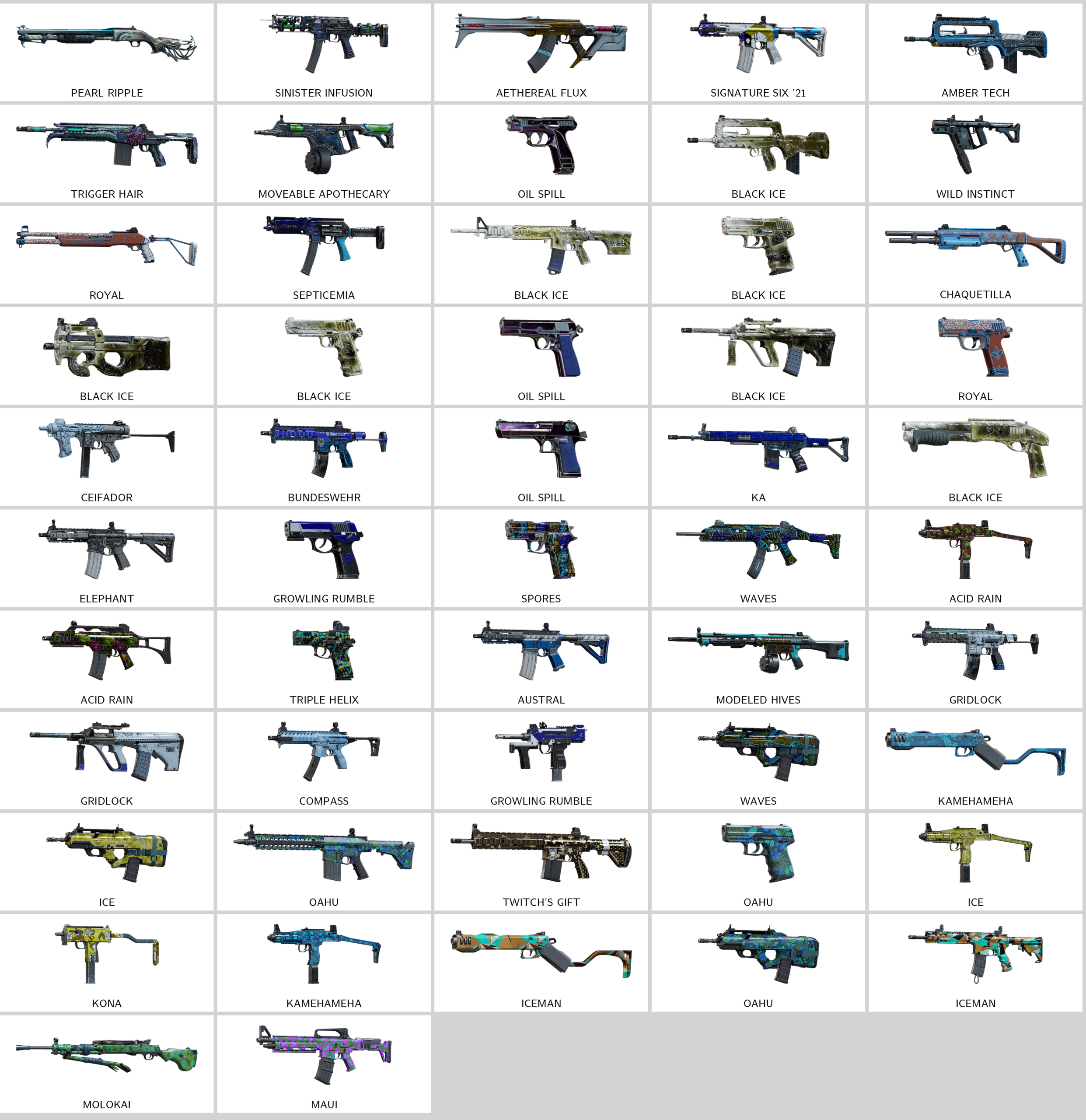 – Flight of Triumph (M12), Amber Tech (F2), Metallurgic Burn (9mm C1), Urban Graffiti (Type-89), Tentacle Lace (ACS12), Stone Talon (T-5 SMG)…