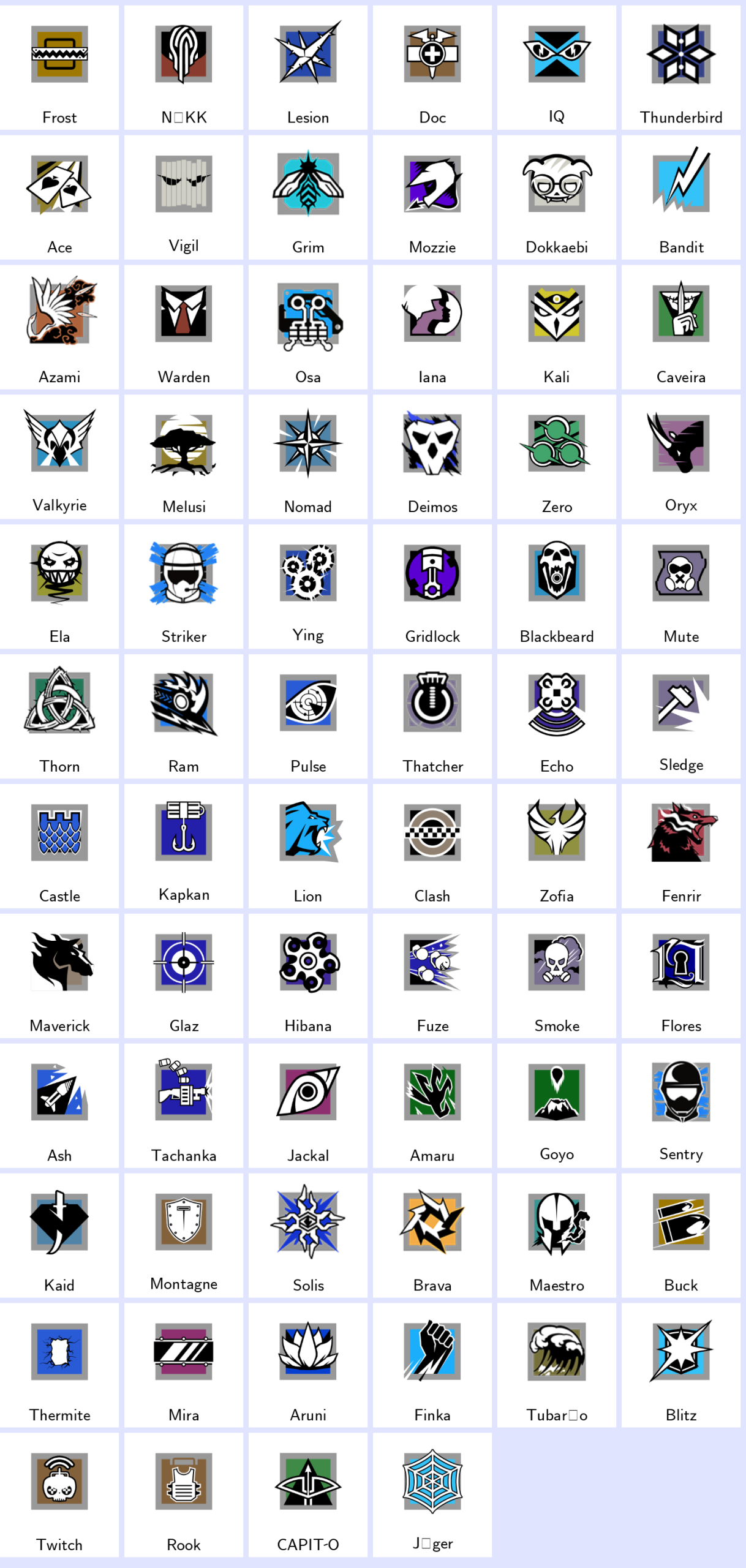 Some Operators: Frost, Nokk, Lesion, Doc, Iq, Thunderbird, Ace, Vigil, Grim, Mozzie…