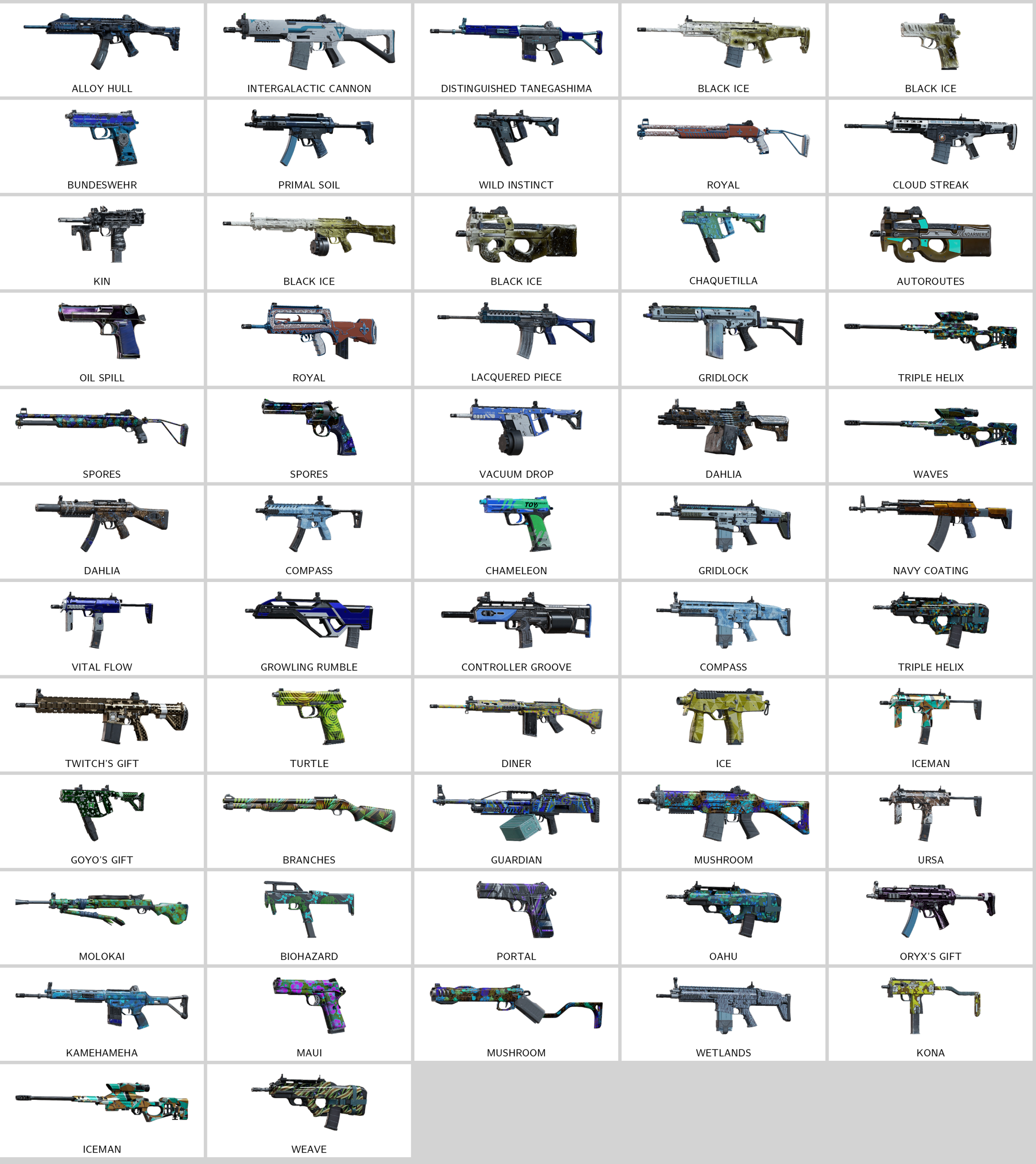 – Metallurgic Burn (9mm C1), Intergalactic Cannon (552 Commando), Distinguished Tanegashima (Type-89), Alloy Hull (Scorpion), Mew Mew Mew (AK-74M), Gritty (ITA12S)
