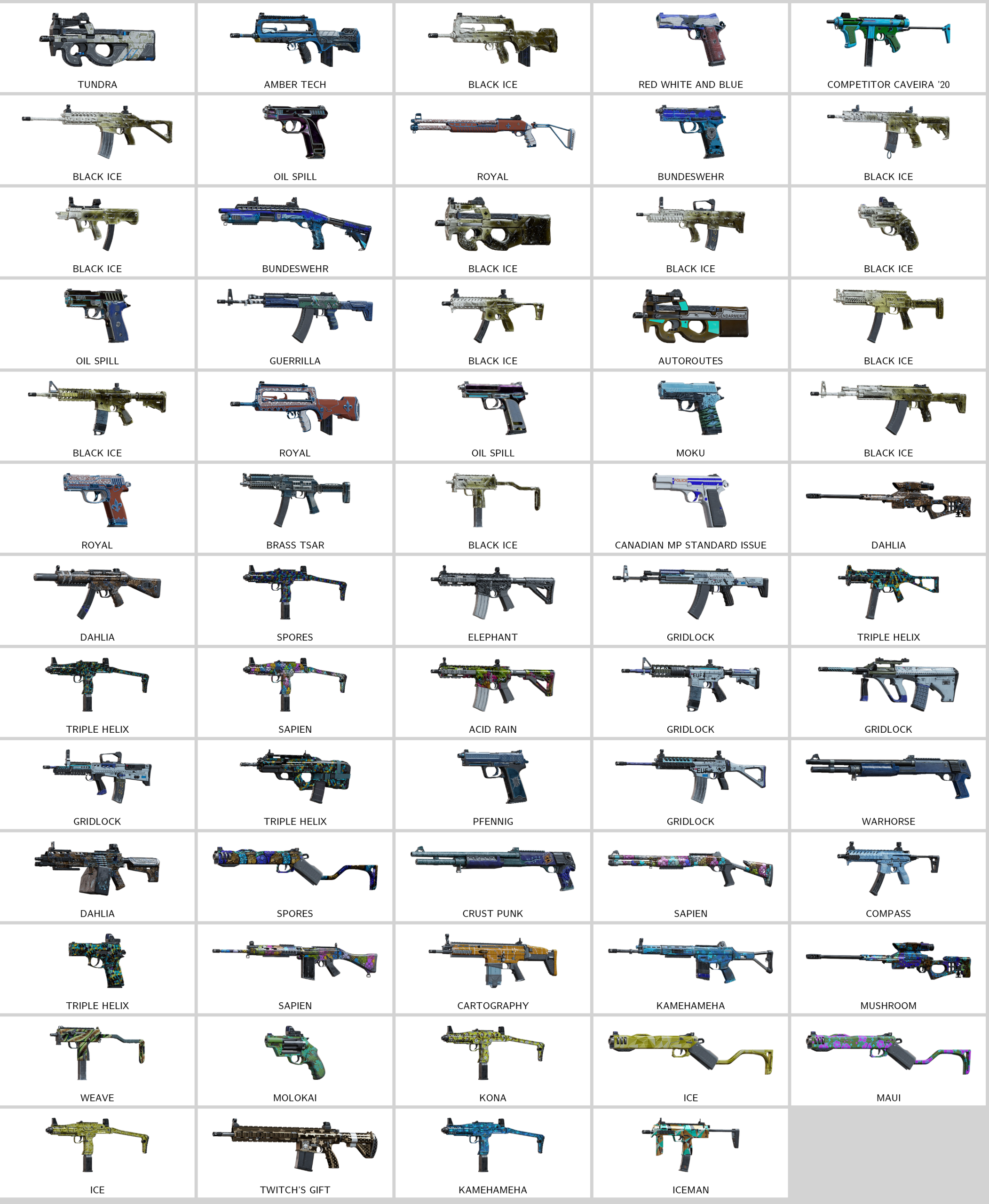 Some of Other Skins: Competitor Caveira ’20 (M12), Red White And Blue (M45 Meusoc), Bundeswehr (P12), Royal (SG-CQB), Fatal Koi (Supernova), Oil Spill (GSH-18), Datum Processor (SMG-12), New Notches (P226)…