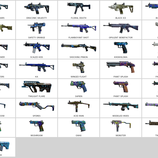 – Comic Strip (P10 Roni), Unerring Versatility (PRB92), Primus Pilus (V308), High-relief (9mm C1), Overland Journey (AUG A3), Recharging Adder (Type-89)…
