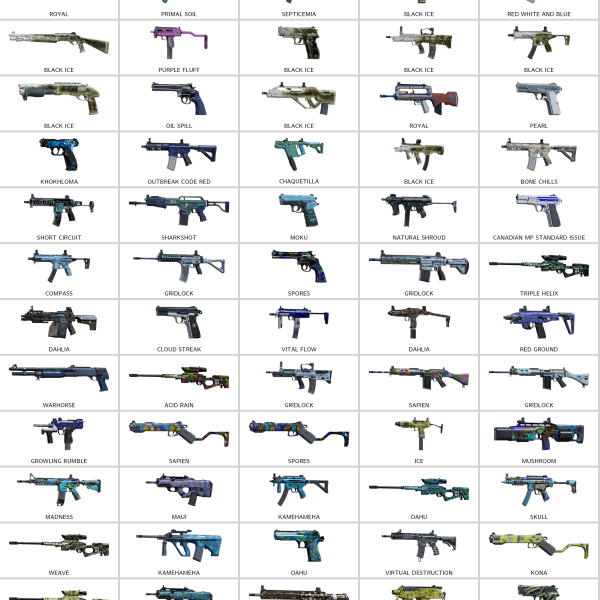 – Subatomic Beam (PDW9), Flight of Triumph (M12), Amber Tech (F2), Urban Graffiti (Type-89), Dark Depths (L85A2), The Old Stock (L85A2)…