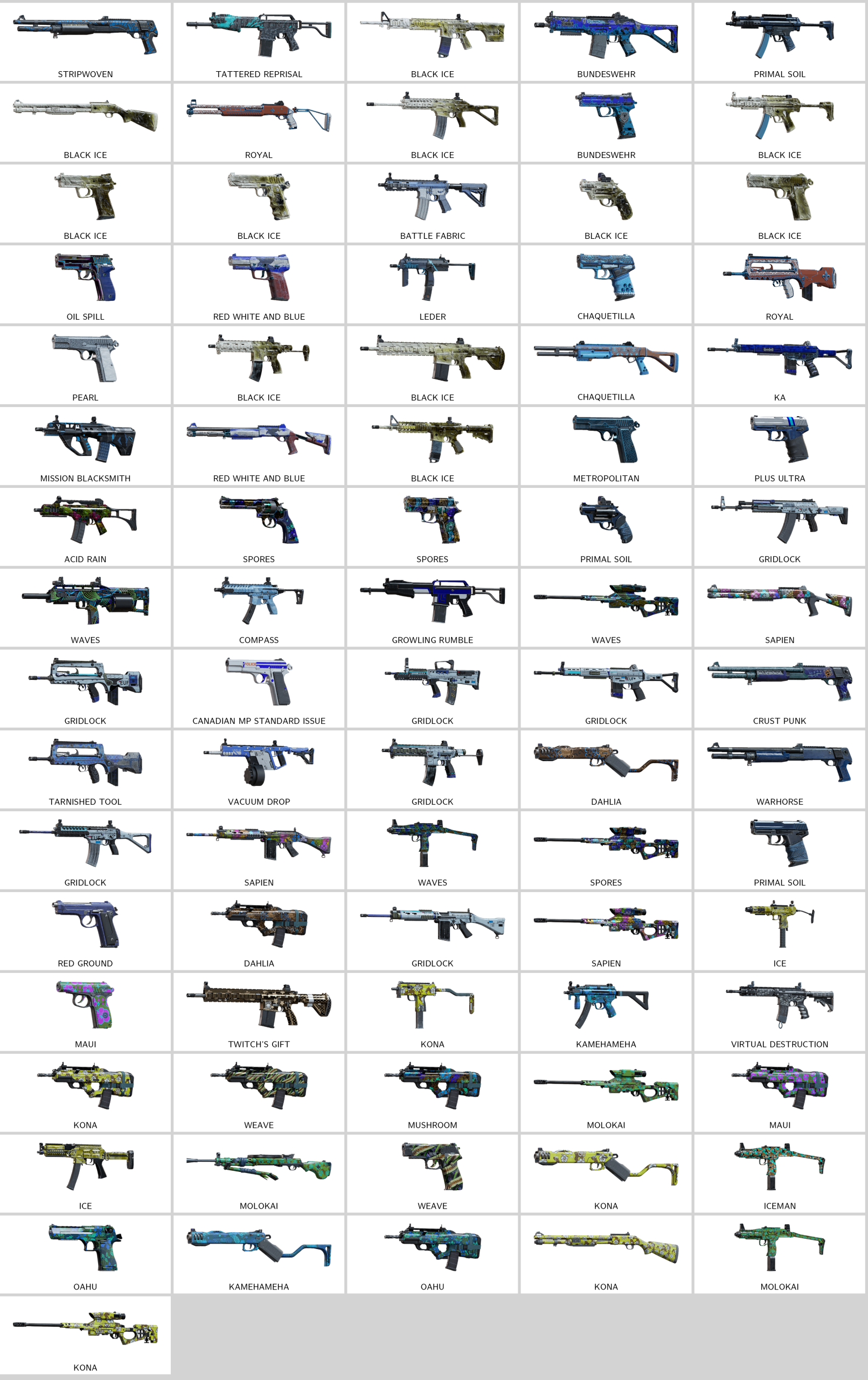 – Subatomic Beam (PDW9), Flight of Triumph (M12), Metallurgic Burn (9mm C1), Tentacle Lace (ACS12), Unbreakable Shine (CSRX300), Stripwoven (Super 90)…
