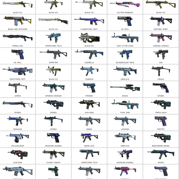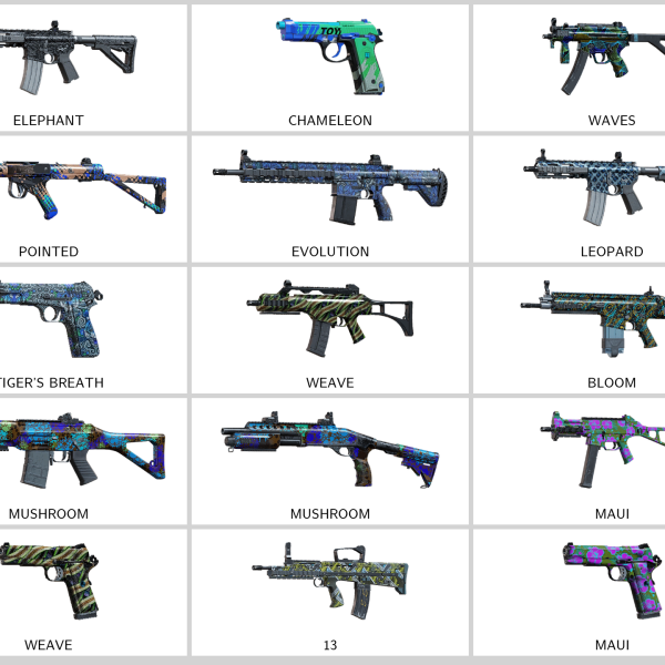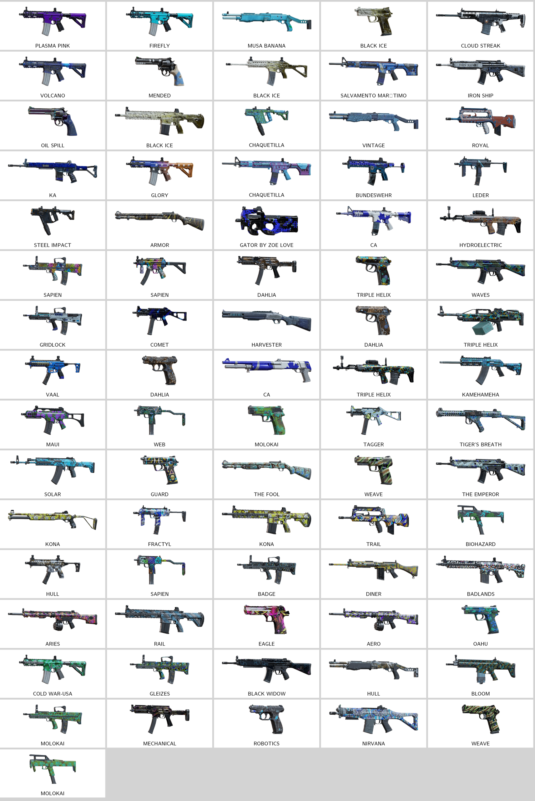 – Ruby, Emerald, Modern USA Camo, Cold War-FRA, Plasma Pink, Firefly…