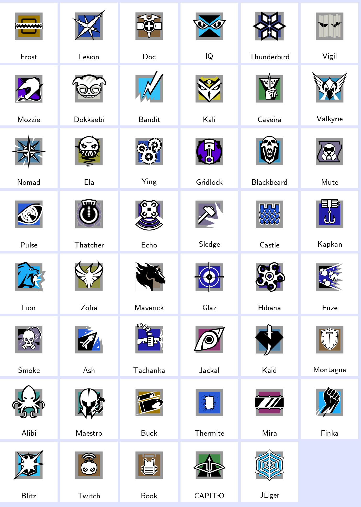 Some Operators: Frost, Lesion, Doc, Iq, Thunderbird, Vigil, Mozzie, Dokkaebi, Bandit, Kali…