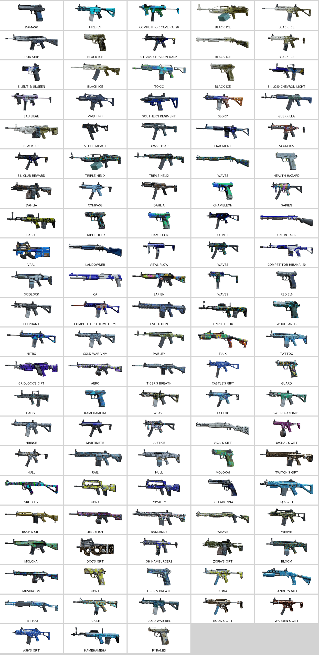 Some of Other Skins: Competitor Caveira ’20 (M12), Black Ops (AK12), S.I. 2020 Chevron Light (L85A2), Loyal Forces (Mx4 Storm), Venetian Golden Age (Mx4 Storm), Leder (M870), Vaquero (G36C), Sunstark (V308)…