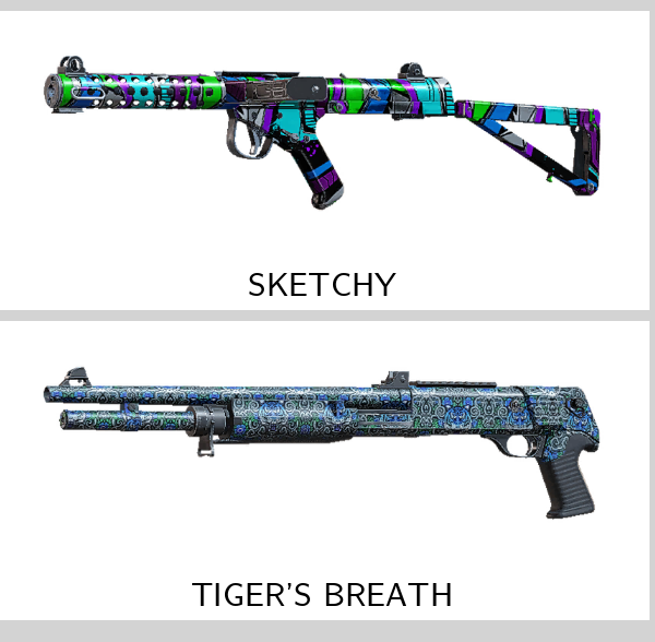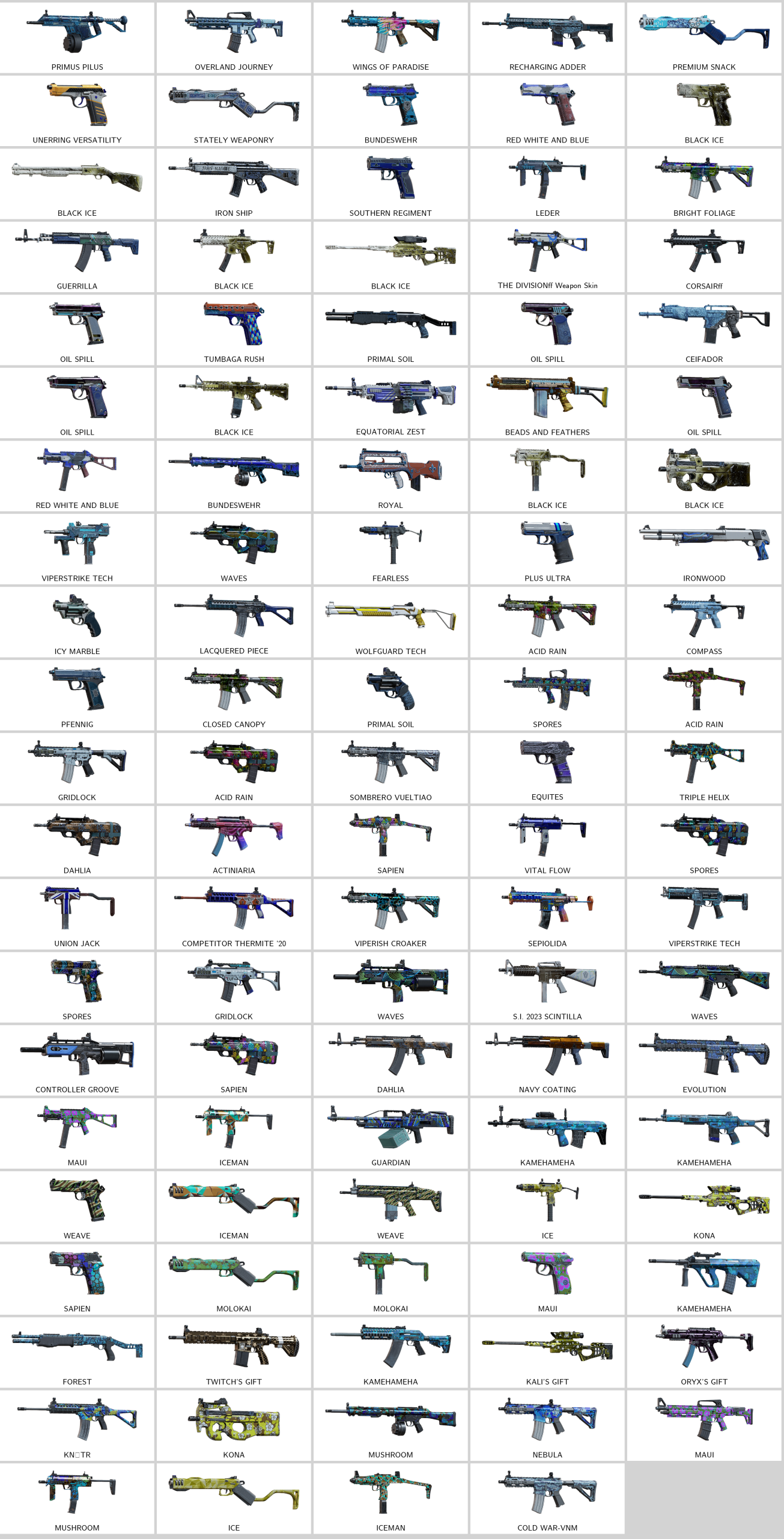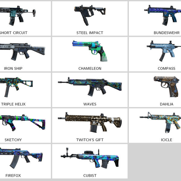 – Ethereal Marksman (416-C), Urban Graffiti (Type-89), Unerring Versatility (PRB92), Primus Pilus (V308), Dark Depths (L85A2), Scavenged Wonder (CAMRS)…