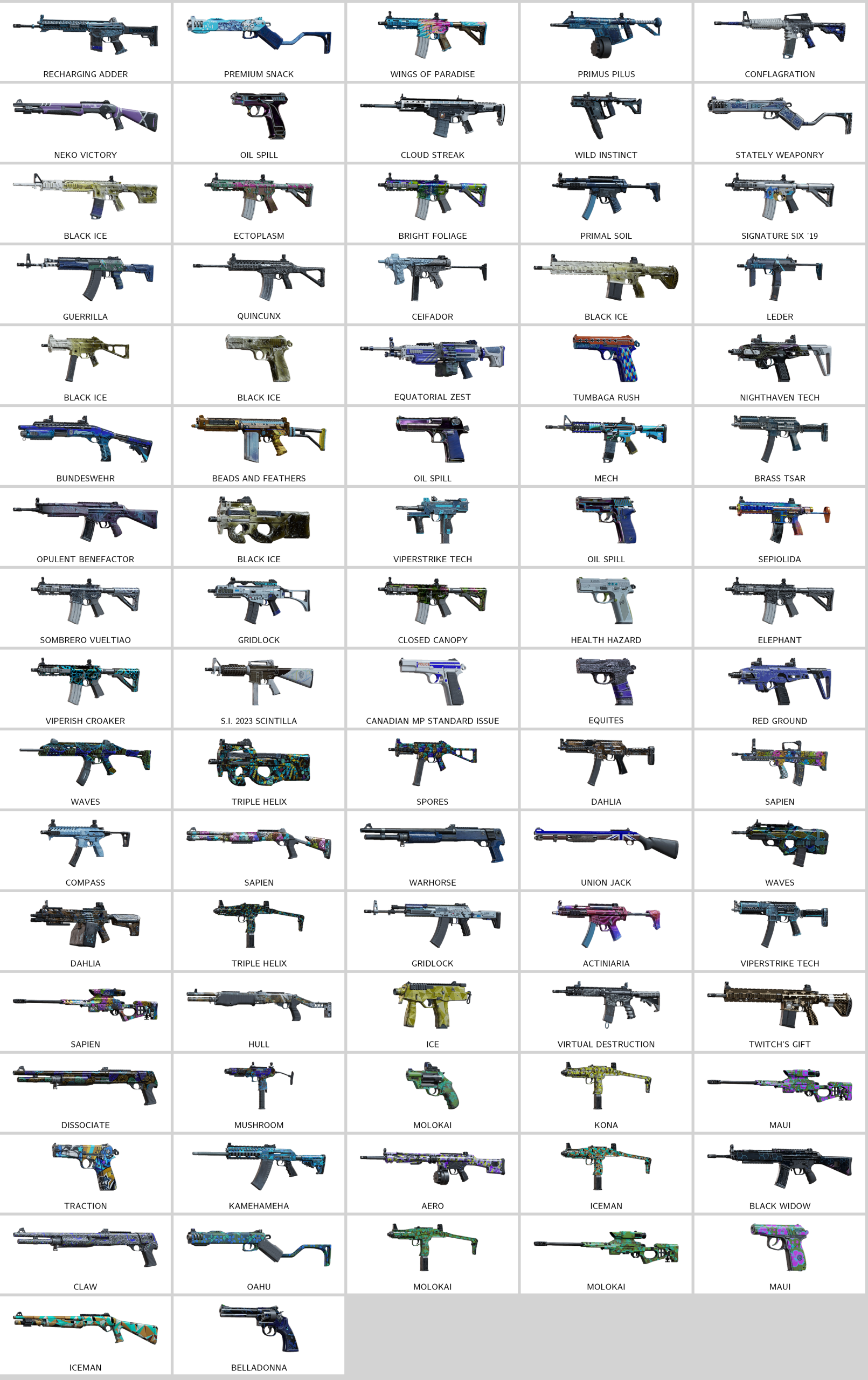 – Safety Yellow (MP5K), Air Raid (CSRX300), Mythical Majesty (AK-74M), Urban Graffiti (Type-89), Primus Pilus (V308), Tattered Reprisal (M12)…