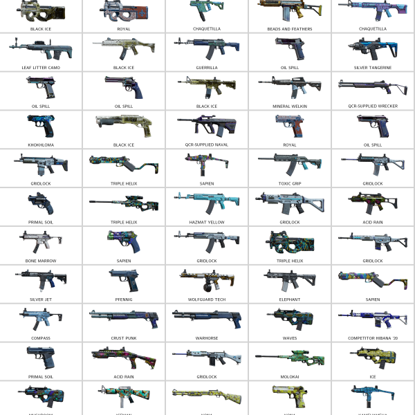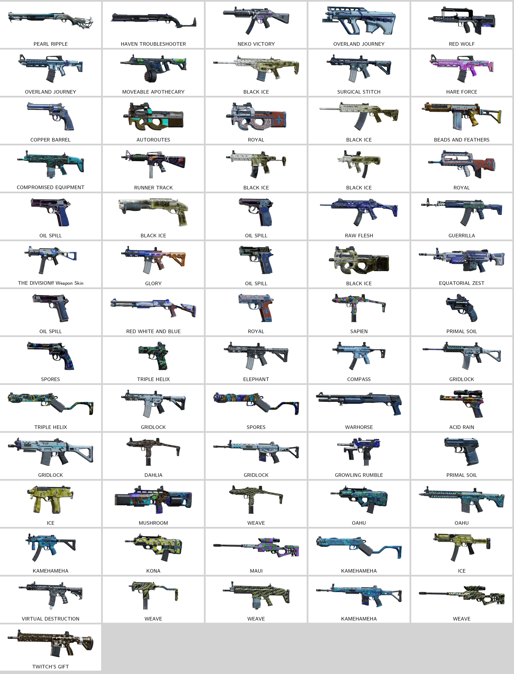 Some Skins: Twitch’S Gift, Glory, Triple Helix, Oahu, Sapien, Gridlock, Surgical Stitch, Weave, Kamehameha, Elephant, Warhorse, Compass, Guerrilla, Dahlia, Runner Track, Oil Spill, Equatorial Zest, Pearl Ripple, Royal, Primal Soil, Neko Victory, Spores, Kona, Acid Rain, Mushroom, Maui, Ice, Copper Barrel, Growling Rumble, Compromised Equipment, Overland Journey, Raw Flesh, Virtual Destruction, Black Ice, Haven Troubleshooter, Red Wolf, The Division® Weapon Skin, Autoroutes, Hare Force, Beads And Feathers, Moveable Apothecary, Red White And Blue