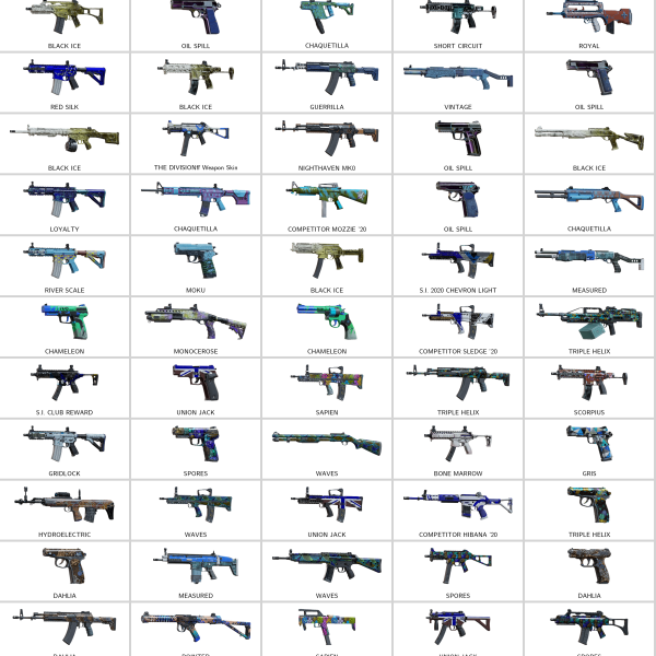 Some Skins: Twitch’S Gift, Glory, Triple Helix, Oahu, Sapien, Gridlock, Surgical Stitch, Weave, Kamehameha, Elephant, Warhorse, Compass, Guerrilla, Dahlia, Runner Track, Oil Spill, Equatorial Zest, Pearl Ripple, Royal, Primal Soil, Neko Victory, Spores, Kona, Acid Rain, Mushroom, Maui, Ice, Copper Barrel, Growling Rumble, Compromised Equipment, Overland Journey, Raw Flesh, Virtual Destruction, Black Ice, Haven Troubleshooter, Red Wolf, The Division® Weapon Skin, Autoroutes, Hare Force, Beads And Feathers, Moveable Apothecary, Red White And Blue