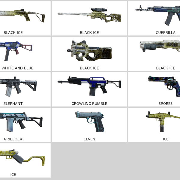 – Subatomic Beam (PDW9), Ethereal Marksman (416-C), Gladius (Keratos), Experimental Unit (P90), Tentacle Lace (ACS12), Golden Repair (Mk 14 EBR)…