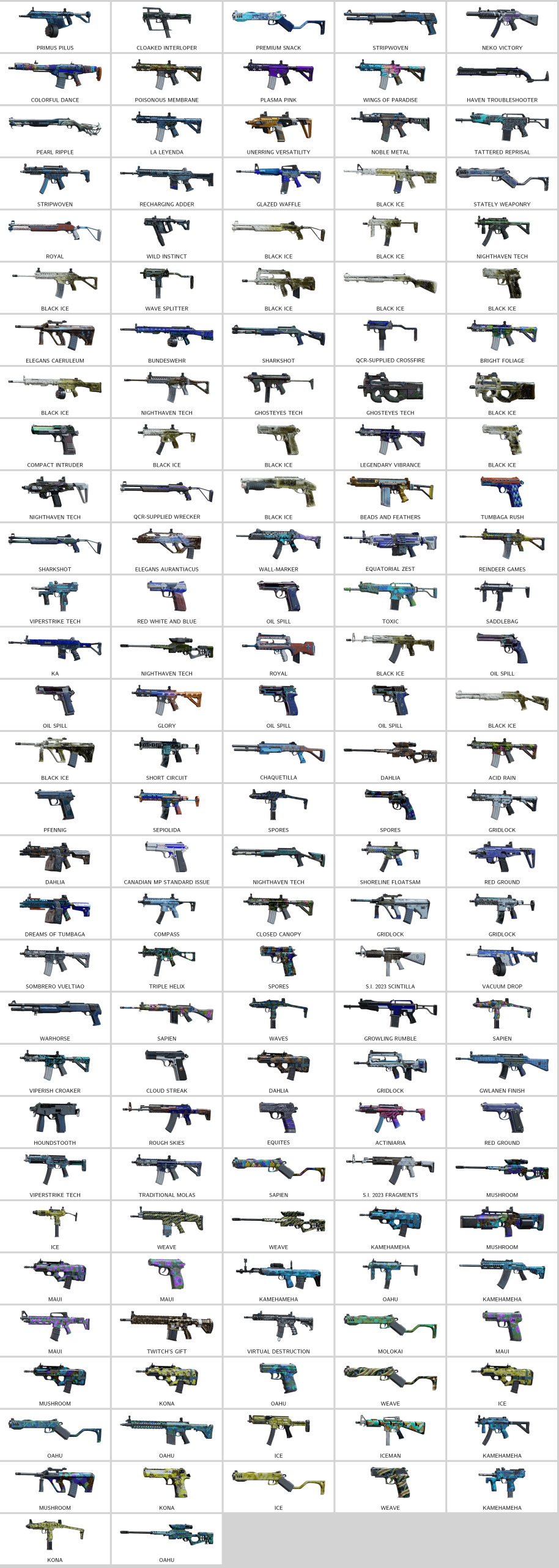 – Colorful Dance (ARX200), Unerring Versatility (P10 Roni), Tentacle Lace (ACS12), Neko Victory (MP5SD), Primus Pilus (V308), Stripwoven (Super 90)…