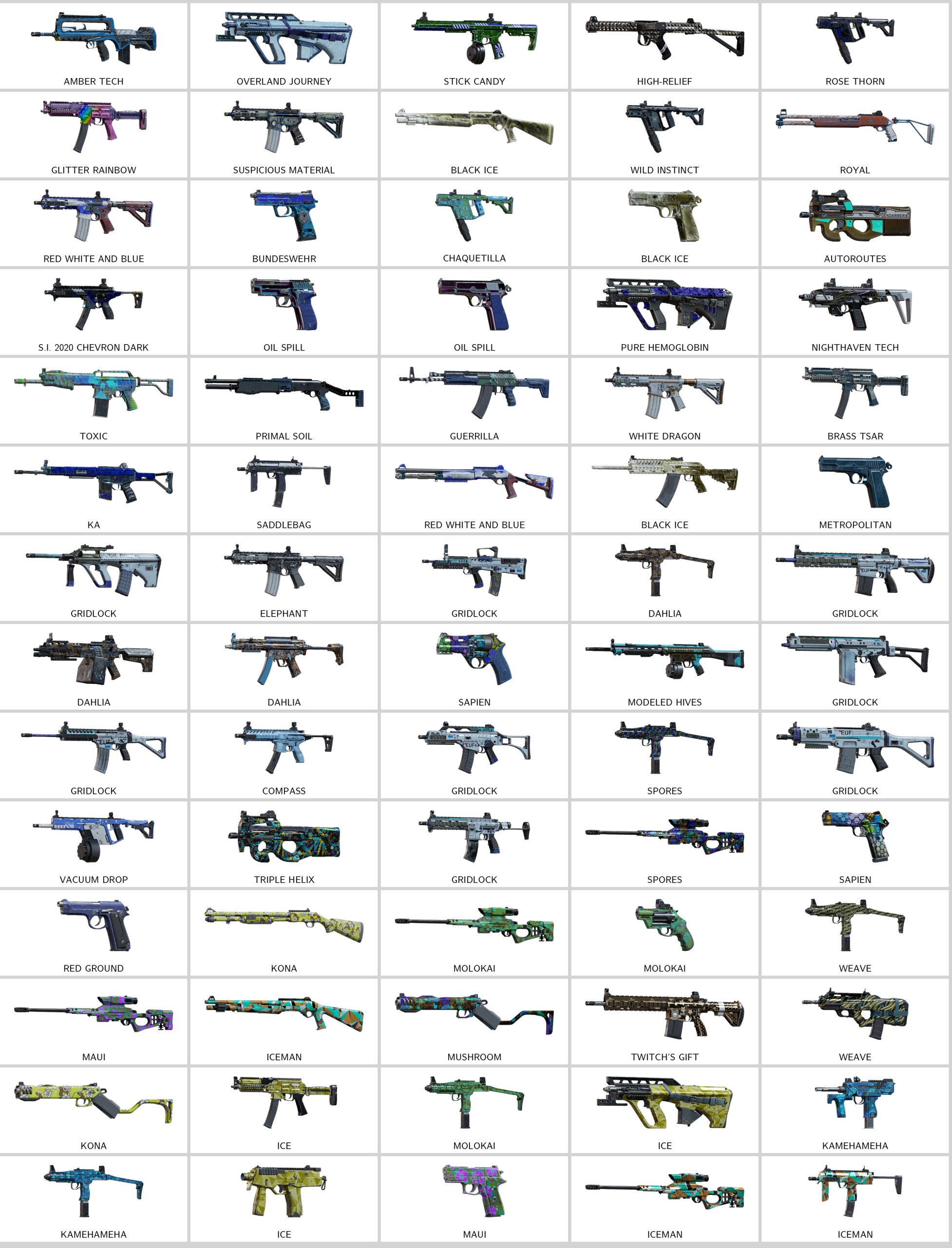 – Ethereal Marksman (416-C), Amber Tech (F2), Urban Graffiti (Type-89), Stone Talon (T-5 SMG), Scavenged Wonder (PARA-308), The Old Stock (L85A2)…