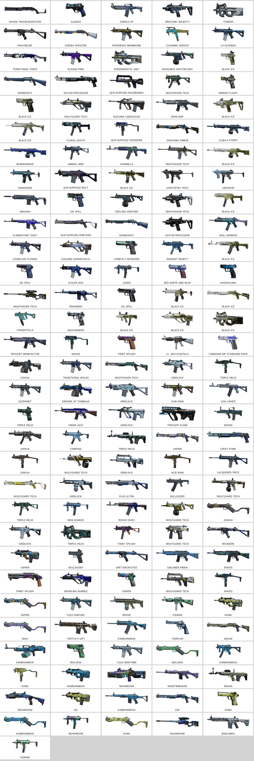 – Tundra (P90), Gladius (Keratos), Experimental Unit (P90), Saddle Up (TCSG12), High-relief (9mm C1), Subsea Shooter (M590A1)…