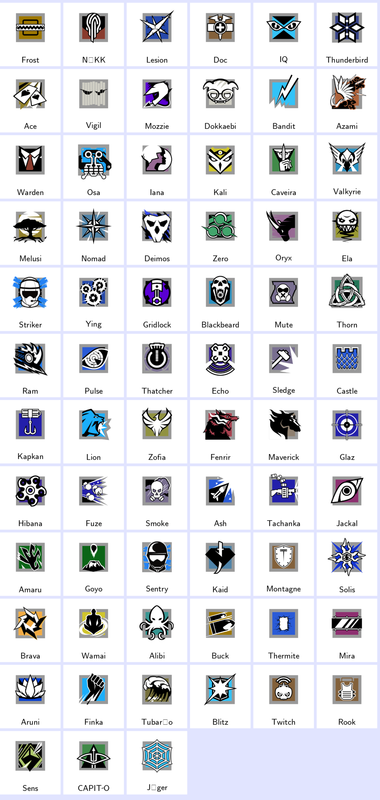 Some Operators: Frost, Nokk, Lesion, Doc, Iq, Thunderbird, Ace, Vigil, Mozzie, Dokkaebi…