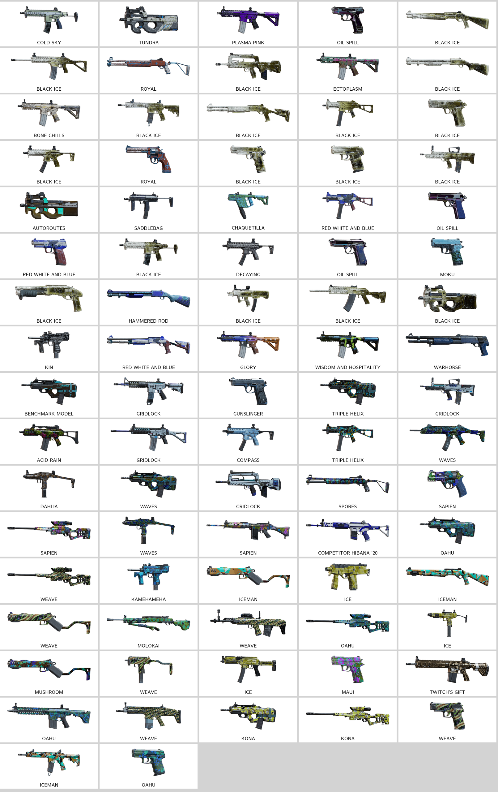 – Subatomic Beam (PDW9), Tundra (P90), Ethereal Marksman (416-C), Flight of Triumph (M12), Lovelace (F2), Subatomic Beam (556XI)…