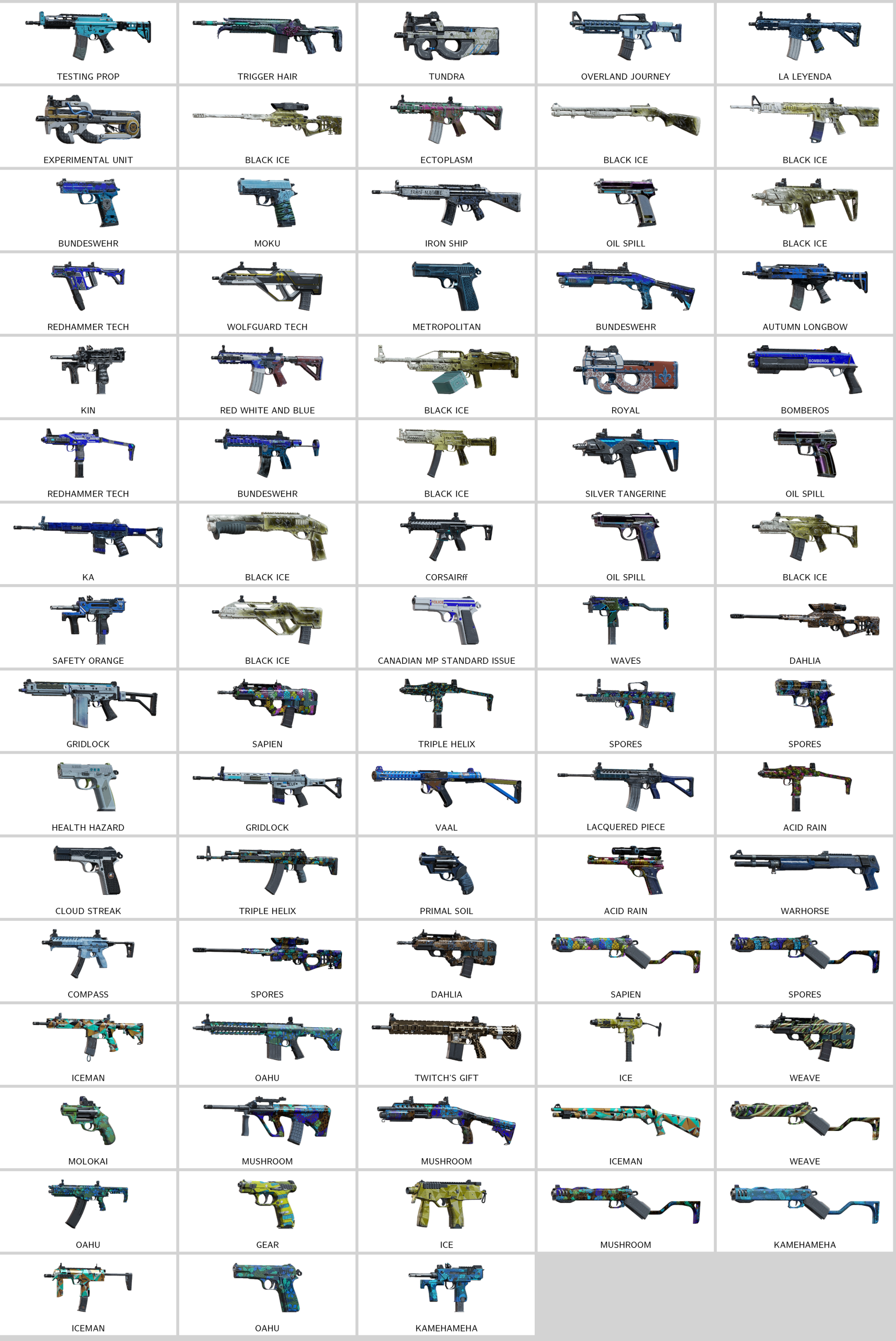 – Testing Prop (K1A), Tundra (P90), Ethereal Marksman (416-C), Experimental Unit (P90), Premium Snack (Mk 14 EBR), Stone Talon (T-5 SMG)…