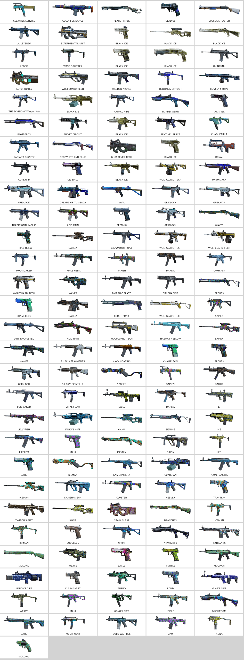 – Gladius (Keratos), Colorful Dance (ARX200), Metallurgic Burn (9mm C1), Experimental Unit (P90), Premium Snack (Mk 14 EBR), Urban Graffiti (Type-89)…