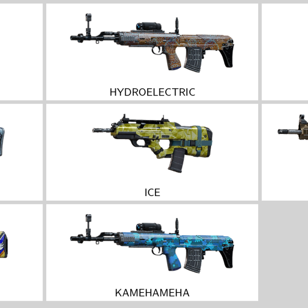 – Metallurgic Burn (9mm C1), Tentacle Lace (ACS12), High-Relief (Super 90), Stone Talon (T-5 SMG), Unbreakable Shine (CSRX300), Metal Typhoon (Bearing-9)…