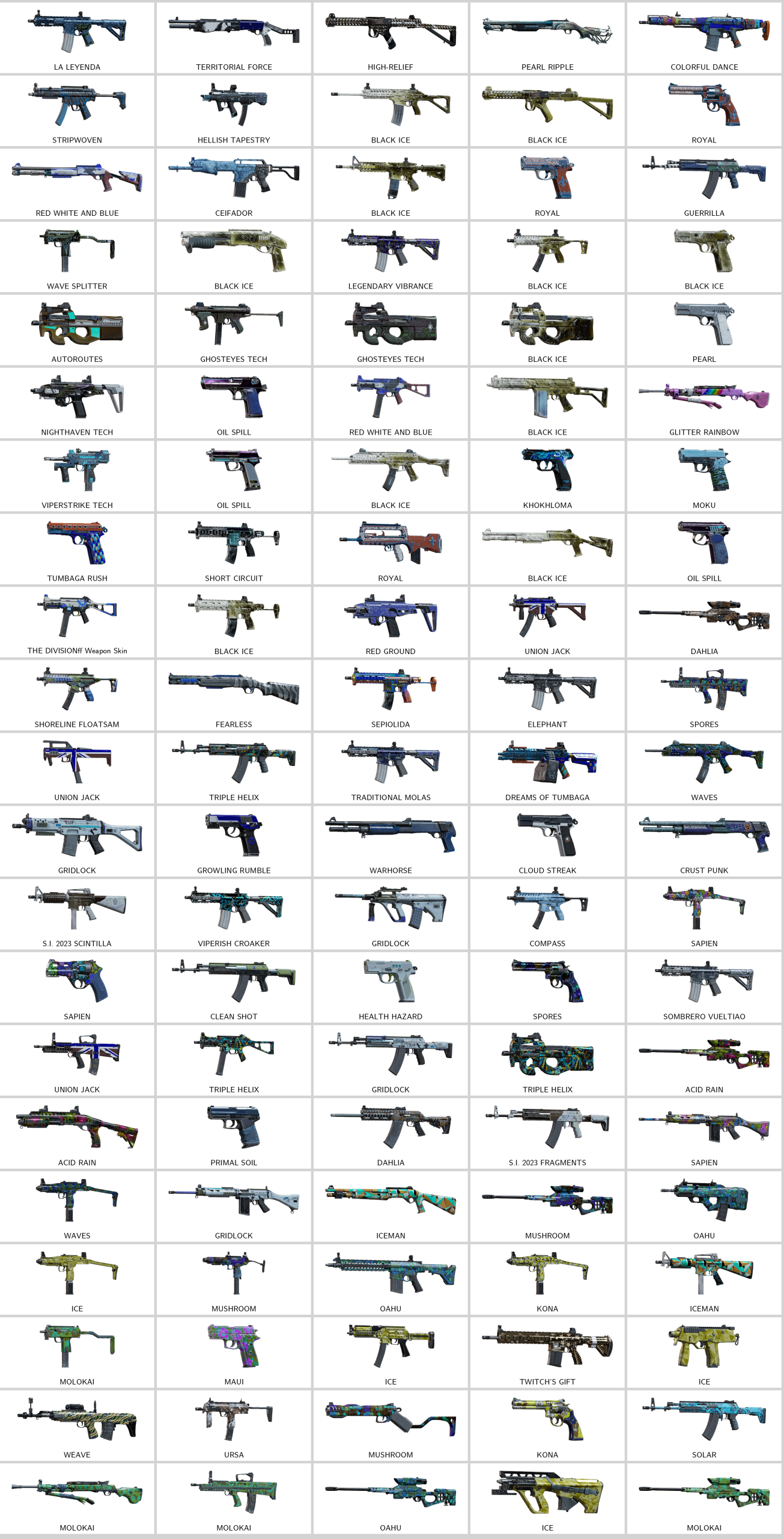– Colorful Dance (ARX200), Air Raid (CSRX300), Premium Snack (Mk 14 EBR), Urban Graffiti (Type-89), High-relief (9mm C1), Territorial Force (SPAS-12)…