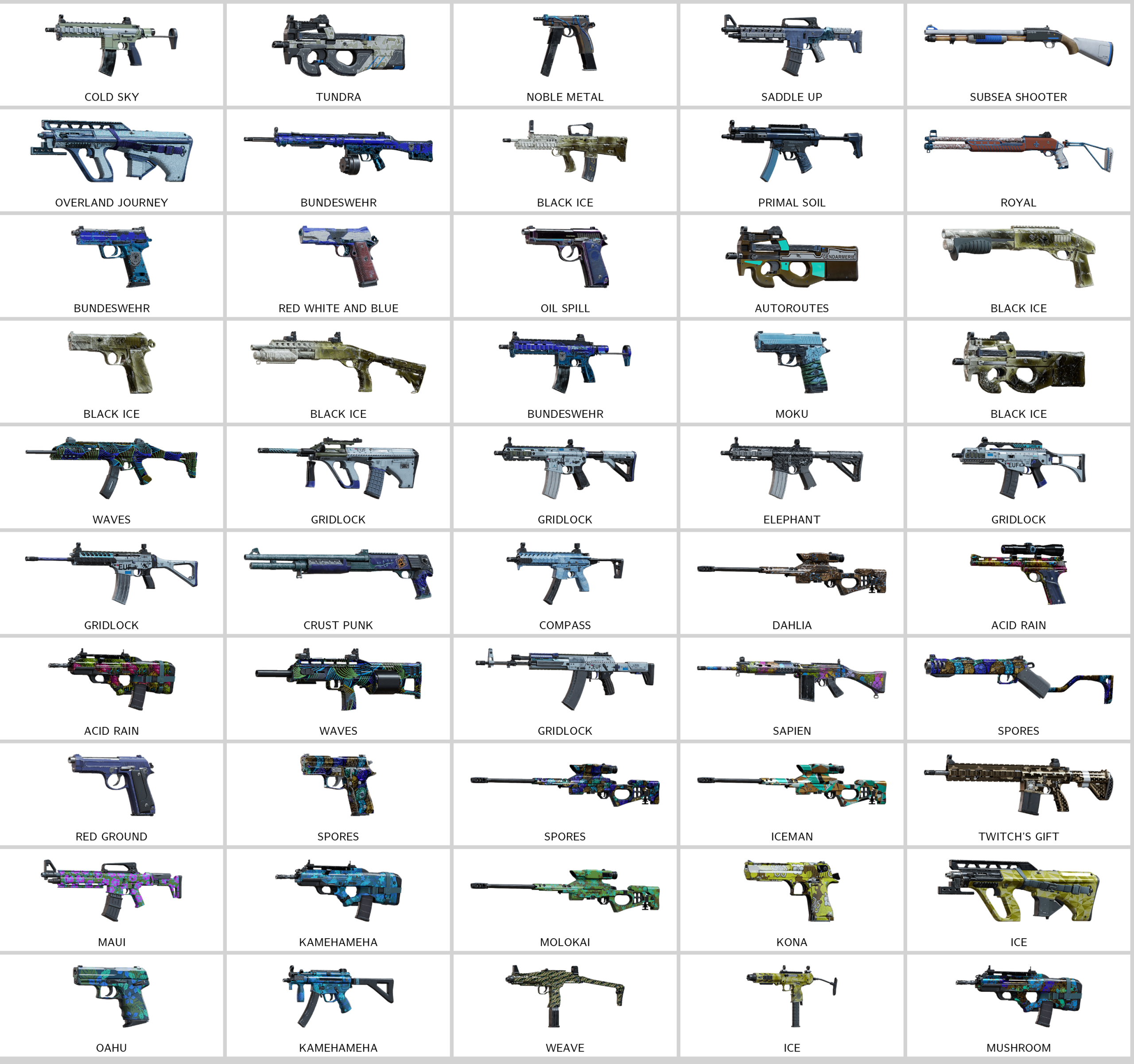 – Tundra (P90), Tattered Reprisal (M12), Saddle Up (TCSG12), Subsea Shooter (M590A1), Overland Journey (AUG A3), Immemorial Art (V308)…