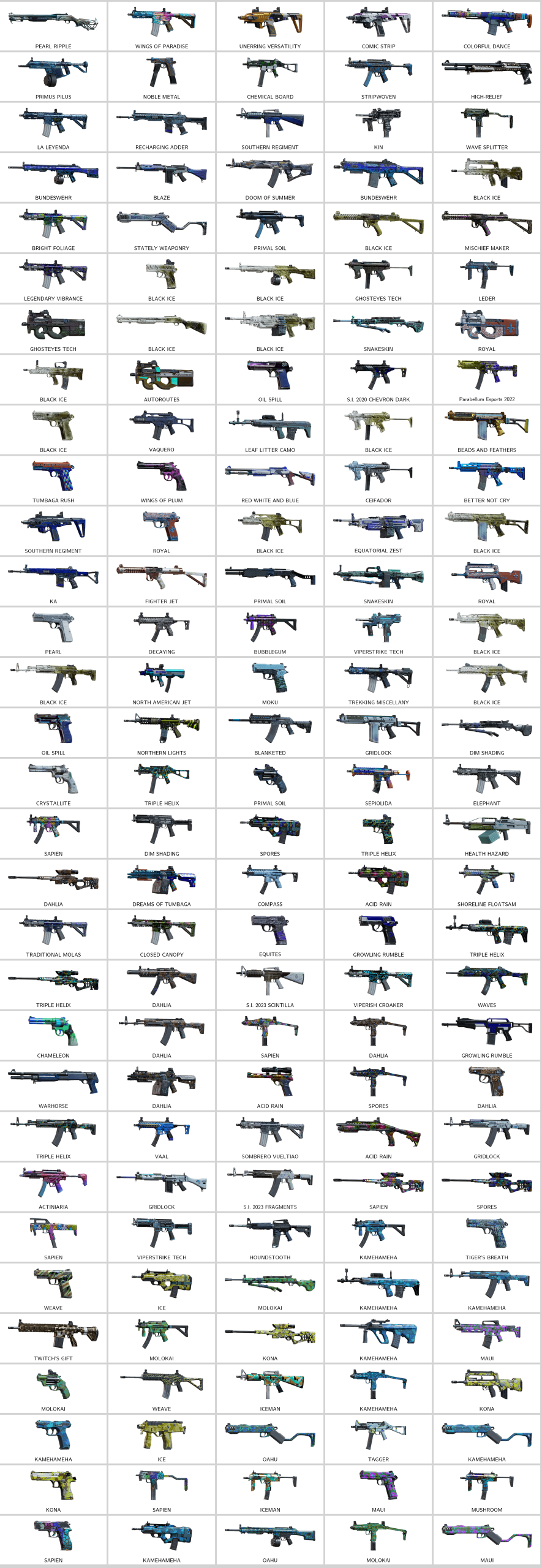 – Colorful Dance (ARX200), Comic Strip (P10 Roni), Unerring Versatility (P10 Roni), Ferrum (M590A1), High-Relief (Super 90), Stone Talon (T-5 SMG)…