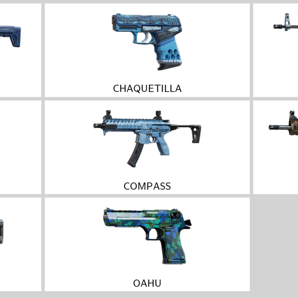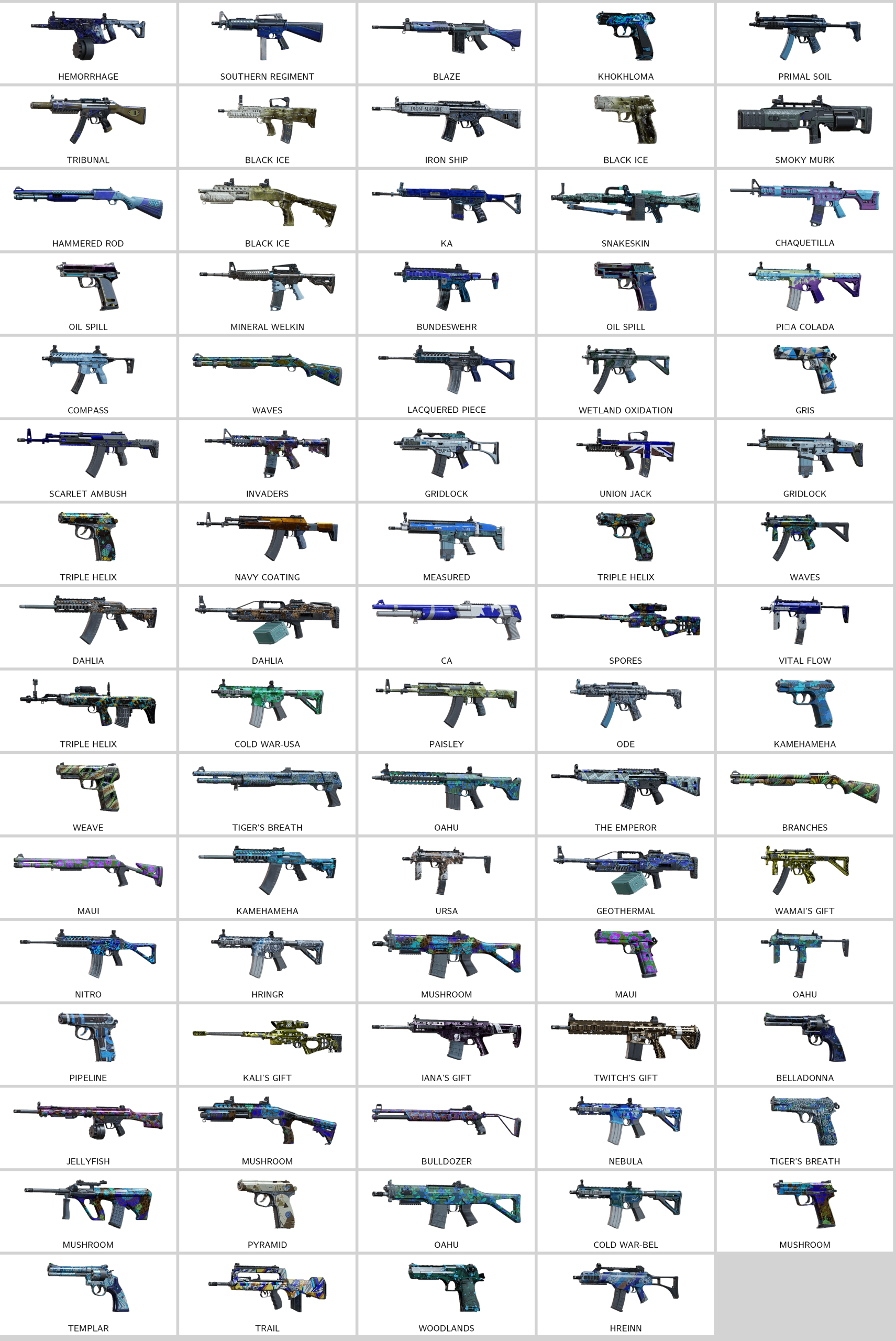 Some Skins: Mineral Welkin, The Emperor, Khokhloma, Hemorrhage, Triple Helix, Maui, Ursa, Geothermal, Paisley, Tiger’S Breath, Oahu, Gridlock, Primal Soil, Vital Flow, Trail, Kamehameha, Waves, Nebula, Black Ice, Gris, Dahlia, Hreinn, Iana’S Gift, Bulldozer, Hringr, Jellyfish, Southern Regiment, Oil Spill, Wetland Oxidation, Iron Ship, Twitch’S Gift, Ode, Scarlet Ambush, Measured, Blaze, Cold War-Usa, Tribunal, Woodlands, Templar, Kali’S Gift, Wamai’S Gift, Ka, Piña Colada, Snakeskin, Ca, Branches, Nitro, Smoky Murk, Pipeline, Pyramid, Compass, Hammered Rod, Invaders, Belladonna, L…