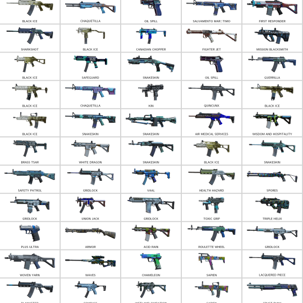 – Gladius (Keratos), Colorful Dance (ARX200), Experimental Unit (P90), High-Relief (Super 90), Unbreakable Shine (CSRX300), Territorial Force (SPAS-12)…