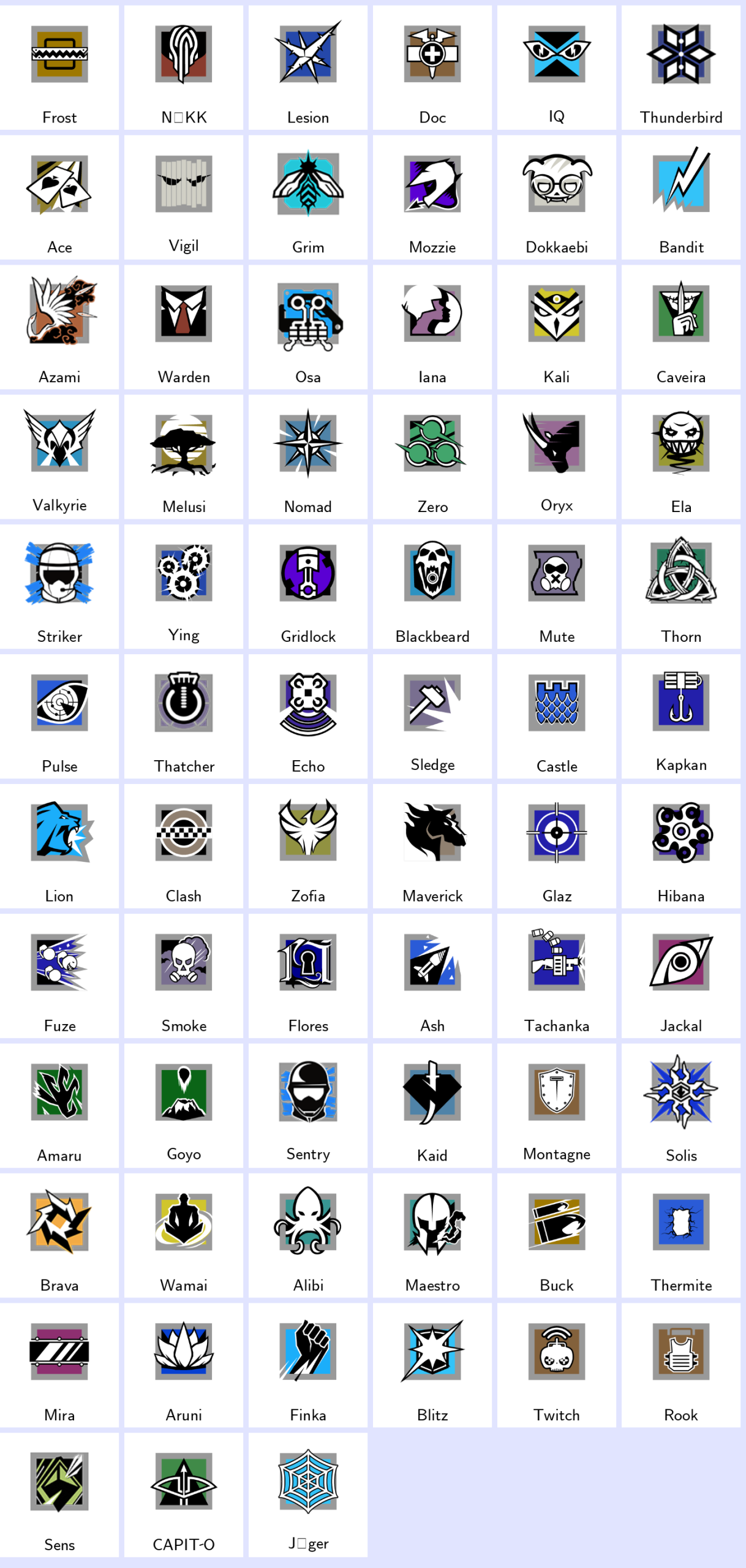 Some Operators: Frost, Nokk, Lesion, Doc, Iq, Thunderbird, Ace, Vigil, Grim, Mozzie…