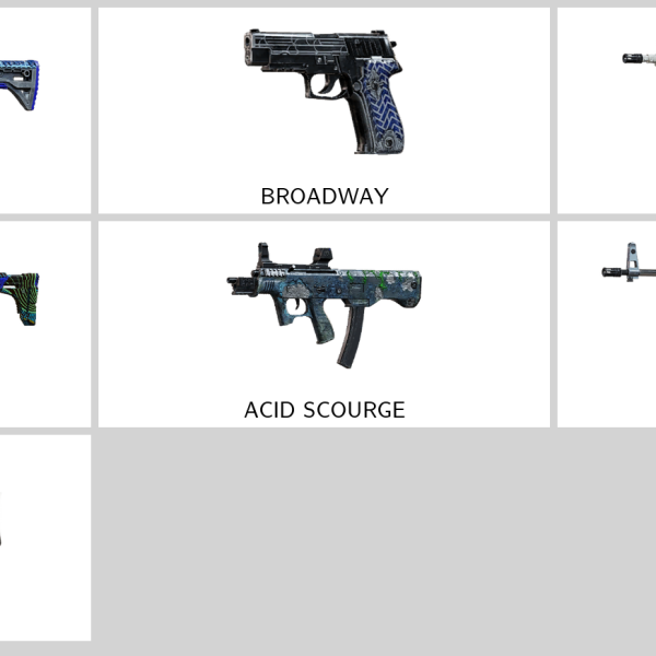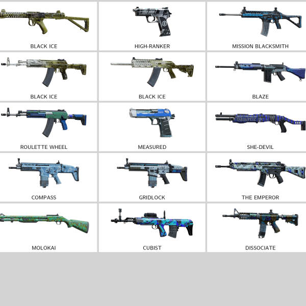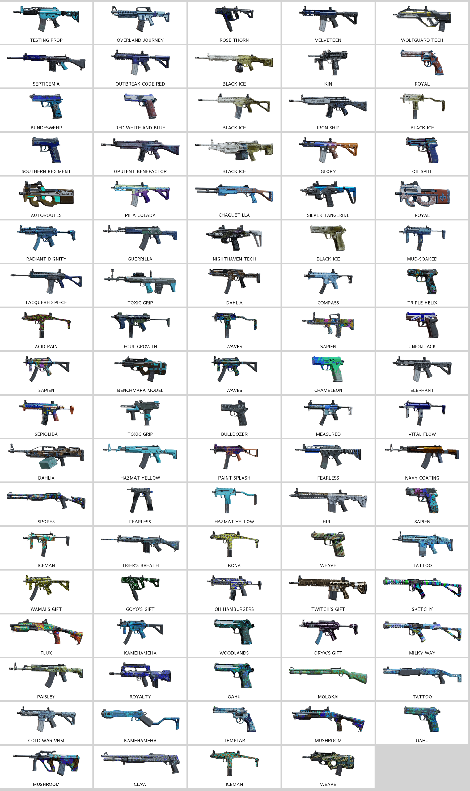 – Testing Prop (K1A), Genesis Marks (OTs-03), Coffee Stain (F90), Overland Journey (TCSG12), Rekt (MP5SD), Speed Shooter (416-C)…
