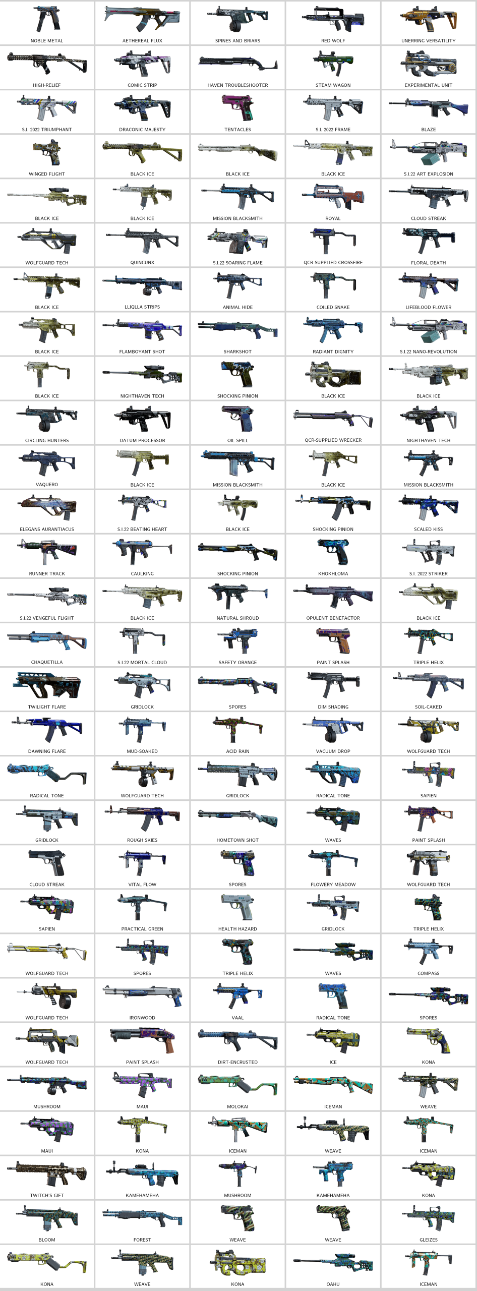 – Comic Strip (P10 Roni), Experimental Unit (P90), Steam Wagon (T-5 SMG), Unerring Versatility (P10 Roni), Spines And Briars (V308), High-relief (9mm C1)…