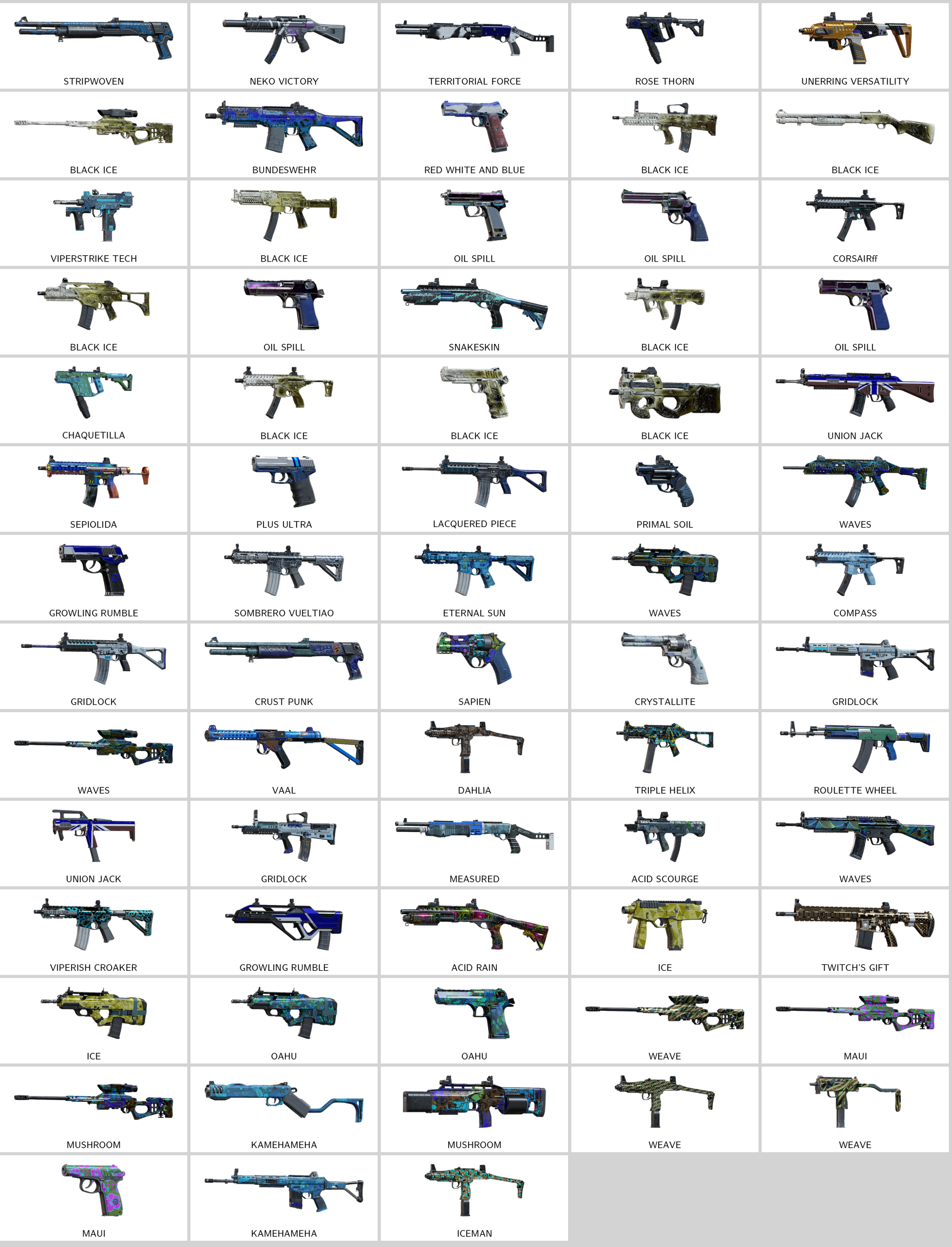 – Unerring Versatility (P10 Roni), Neko Victory (MP5SD), Stripwoven (Super 90), Intergalactic Cannon (AUG A2), Territorial Force (SPAS-12), Tentacle Lace (Mx4 Storm)…