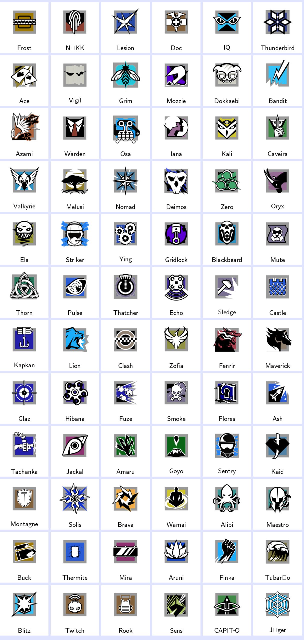 Some Operators: Frost, Nokk, Lesion, Doc, Iq, Thunderbird, Ace, Vigil, Grim, Mozzie…