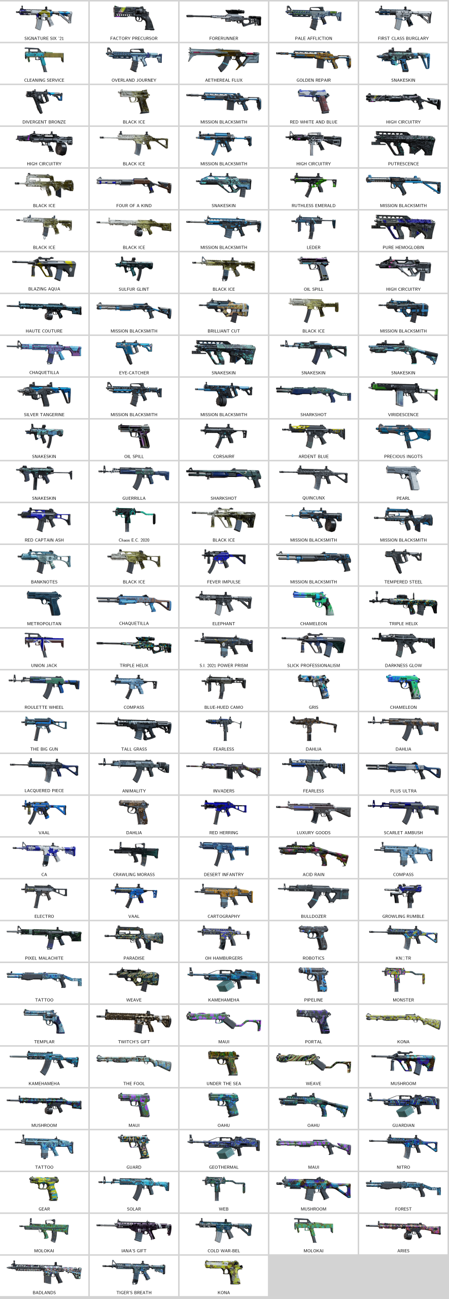 – Flight of Triumph (M12), Metallurgic Burn (9mm C1), Air Raid (CSRX300), Tentacle Lace (ACS12), Golden Repair (Mk 14 EBR), Coffee Stain (F90)…