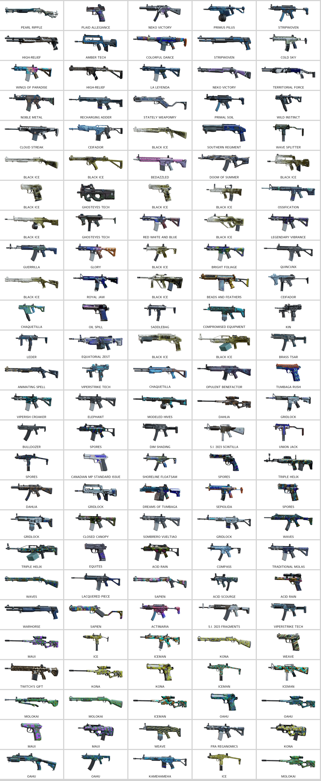 – Colorful Dance (ARX200), Amber Tech (F2), Urban Graffiti (Type-89), High-Relief (Super 90), Stone Talon (T-5 SMG), Unbreakable Shine (CSRX300)…